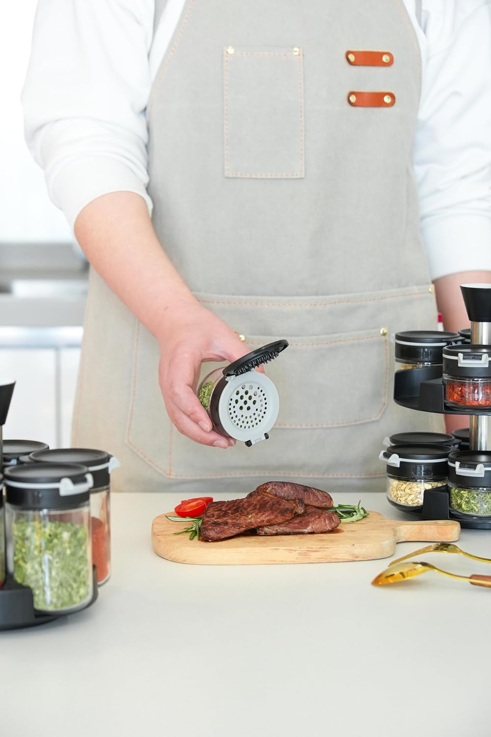• ● High Quality Seasoning Rack: This innovative and made of high quality material makes cooking easier. It provides 3 in 1 option: you can pinch, scoop, and 2 sizes sprinkle. It takes a small amount of space whether on countertop or inside a cabinet. Each jar is made of high quality food grade thick glass for safe, hygienic and sturdy experience.
