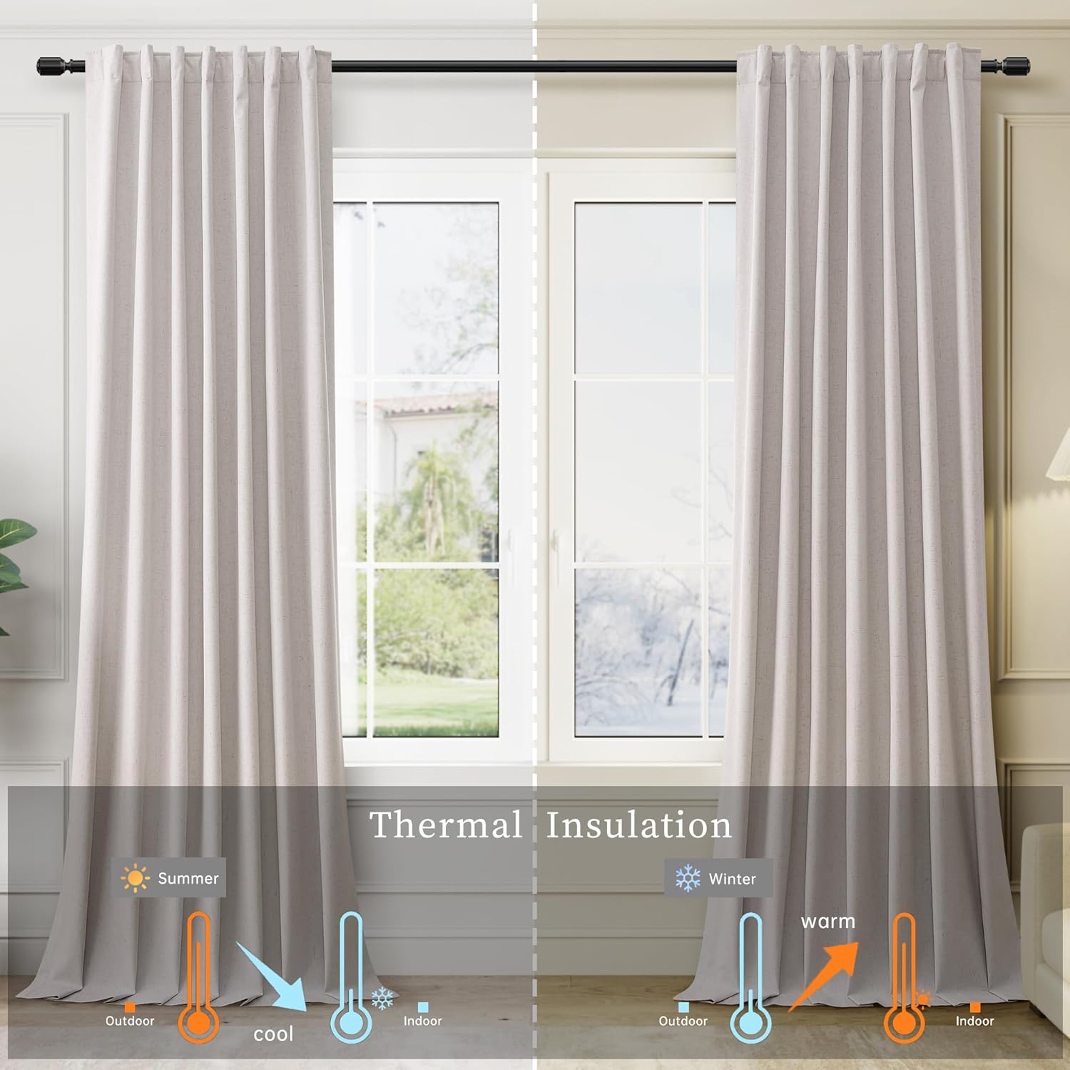 • Thermal Insulated Room Darkening Curtains: The blackout curtains with 300GSM high-density linen blend fabric block out the heat in summer and cool air in winter while sunlight blocking and soundproof. Provide a easy and comfortable home.