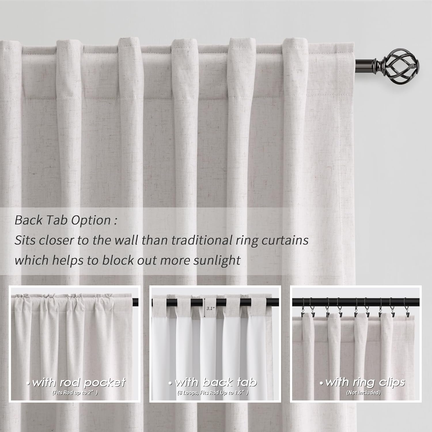 • 3 Hanging Options: Differ from the traditional curtains with grommet, BOODII linen curtains with back tab and rod pocket can full block sunlight fully. (1) Using the back tabs design to create an elegant pleated look and sit closer to the wall than traditional ring curtains, which helps to block out more sunlight; (2) Using rod pocket for a classic effect; (3) Using clip rings on track system or curtain rod, slide open/closed easily (clip rings are not included).