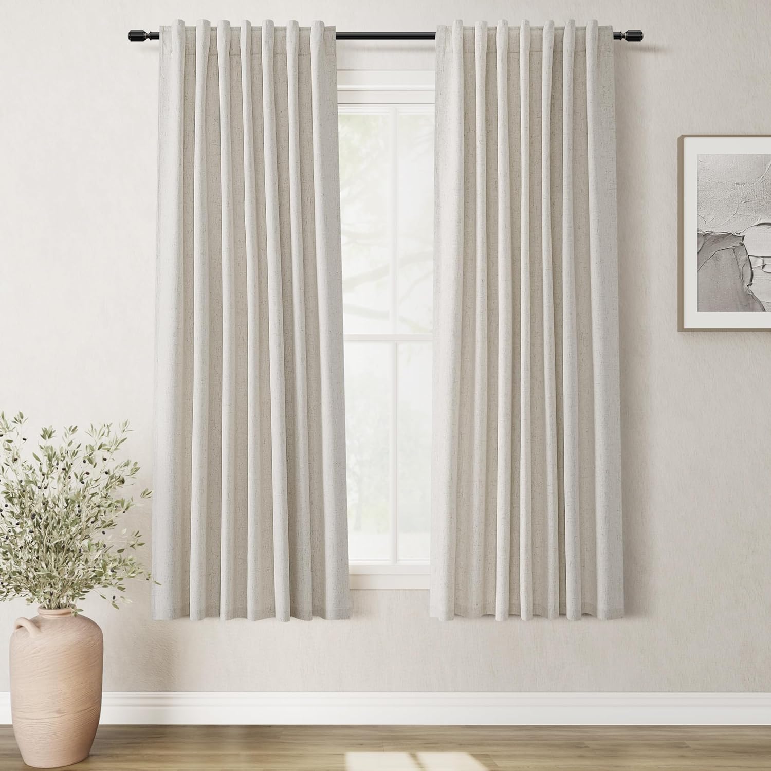 • 3 Hanging Options: Differ from the traditional curtains with grommet, BOODII linen curtains with back tab and rod pocket can full block sunlight fully. (1) Using the back tabs design to create an elegant pleated look and sit closer to the wall than traditional ring curtains, which helps to block out more sunlight; (2) Using rod pocket for a classic effect; (3) Using clip rings on track system or curtain rod, slide open/closed easily (clip rings are not included).