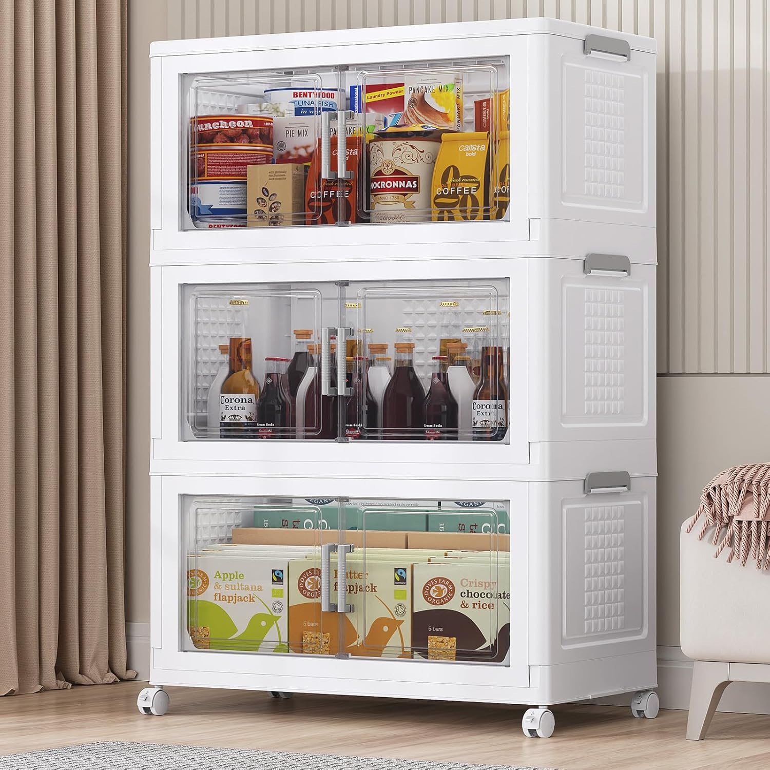 BROVIEW 324 Qt Plastic Storage Bins with Lid, Doors & Wheels, 3Pack Extra Large Stackable Collapsible Storage Bins, Closet Organizers and Storage Drawer, Foldable Cabinets for Home Office, White