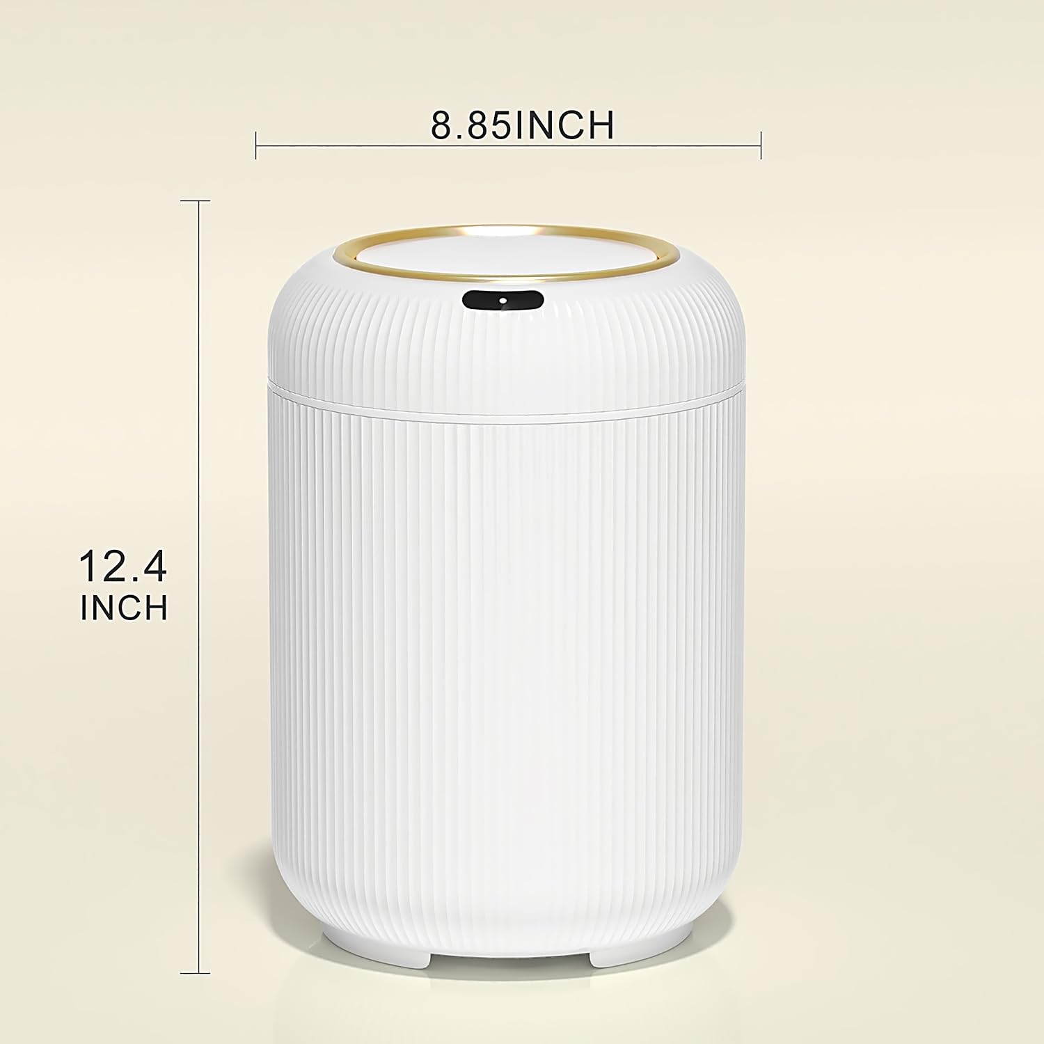 • 【Odor Control & Silent Operation】The no touch diaper pail effectively seals in odors, ensuring a fresh home environment. Its soft lid design minimizes noise, delivering a quiet experience during use.The inside of the white and gold trash can comes with a black pressure ring. Take it out and put a garbage bag over it, you can hide the unpleasant bag inside.