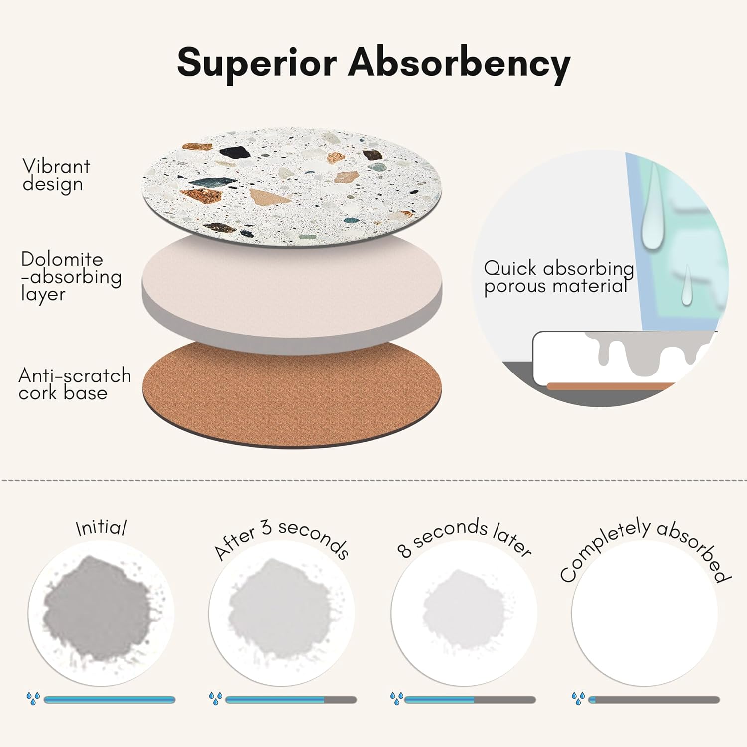 • Highly Absorbent for Hot & Cold Drinks: Our absorbent coasters are made of quality diatomite that absorbs condensation from cold drinks, spills from hot drinks and the absorbency will not detoriate over time.