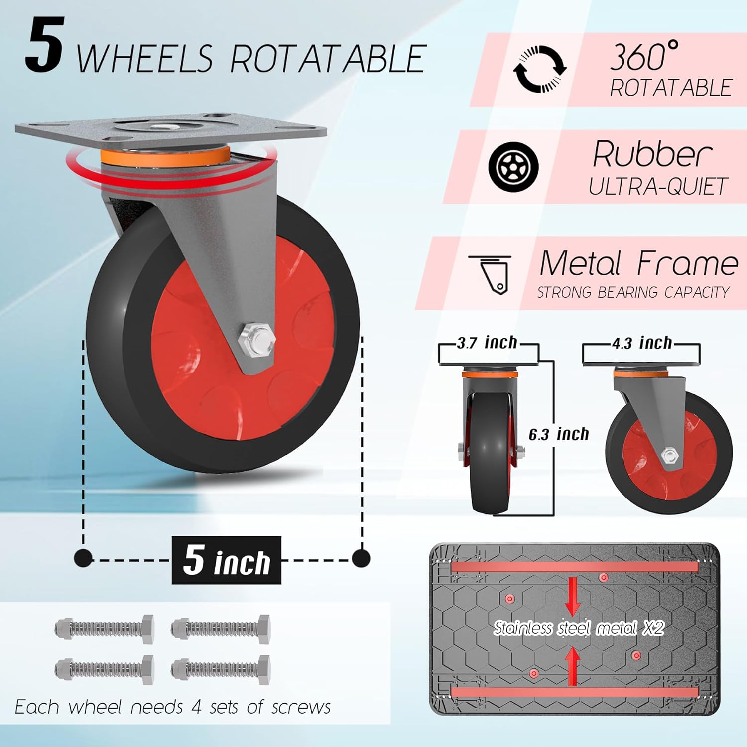 • 【Equipped with 5 Rotatable Wheels】 5 safe 5 -inch heavy wheels can provide 5 stress points, and the carrying capacity is stronger. Folding platform truck's 5 wheels are engineered with 360-degree swivel functionality, compared with the other 4 rounds of carts, there are only 2 wheels 360 -degree rotation, our 5 -wheeled carts are easier to turn during transportation. TPR wheels minimize harsh noise