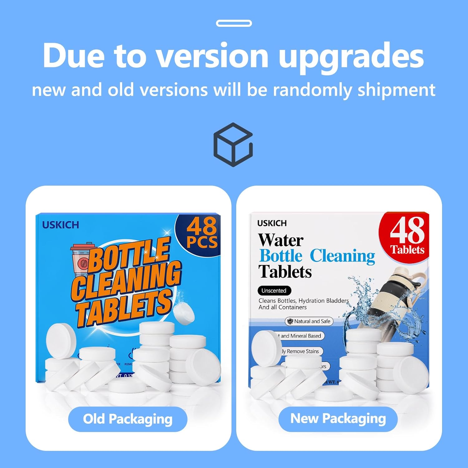 USKICH 48 Pack Water Bottle Cleaning Tablets,Water Bottle Cleaner Great for Stainless Steel, Thermos, Tumbler, Insulated and Reusable Water Bottles,Removes Stubborn Stains and Odors