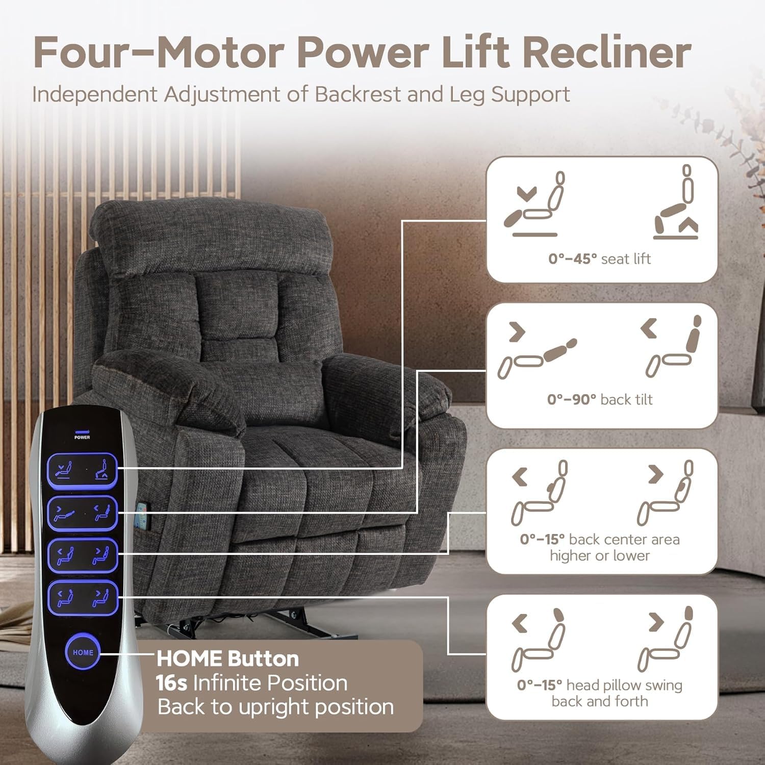 • 【Reliable Operation】 The base lifting system of the power recliner for seniors uses an OKIN system. The pure copper rotor silent motor runs stably, each recliner has passed the no-load and load test without sudden stopping, and the lifting power is enough to support people up to 350 lbs.