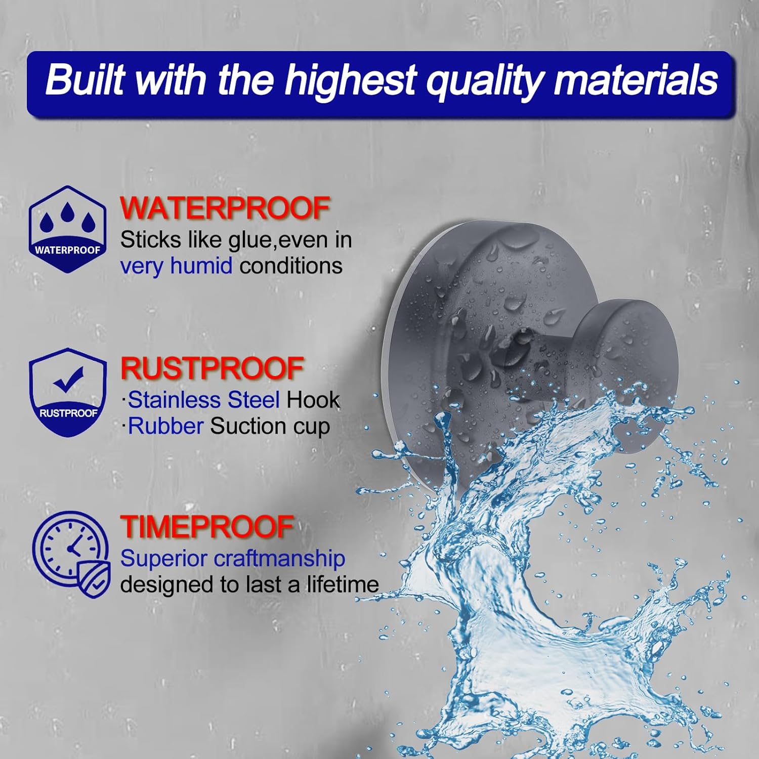 Suction Cup Hooks for Shower, Removable Towel Hooks for Bathroom Window Glass Door Wall, Bath Robe Looafh Hook for Hanging - 2 Pack, Grey