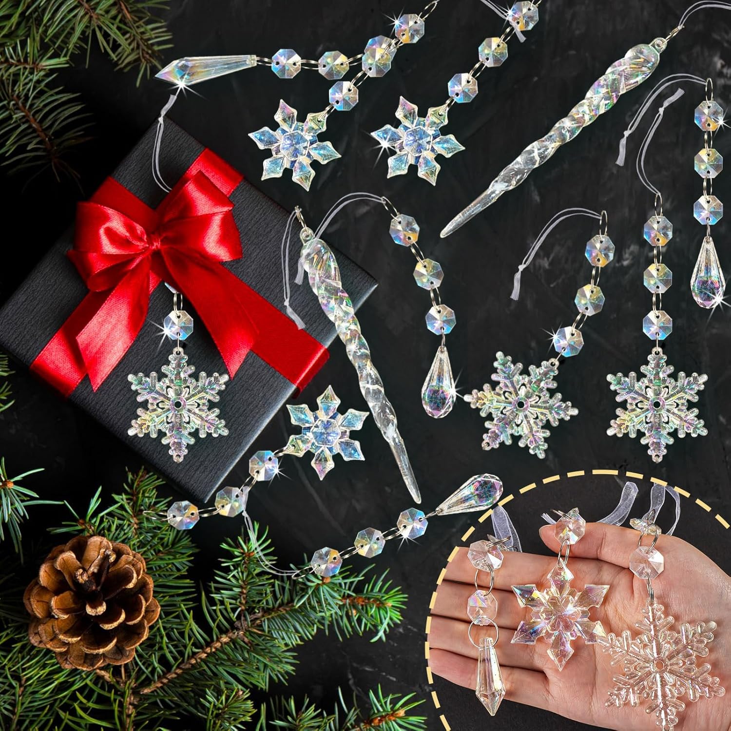 • VALUABLE PACK: Transform your holiday decor with this 80pcs iridescent acrylic Christmas ornaments set. Including 20pcs icicle pendants, 40pcs crystal beads garlands and 20pcs delicate snowflakes ornaments, these snowflake pendants shimmer with a rainbow effect under lights, adding an enchanting touch to your Christmas party decorations