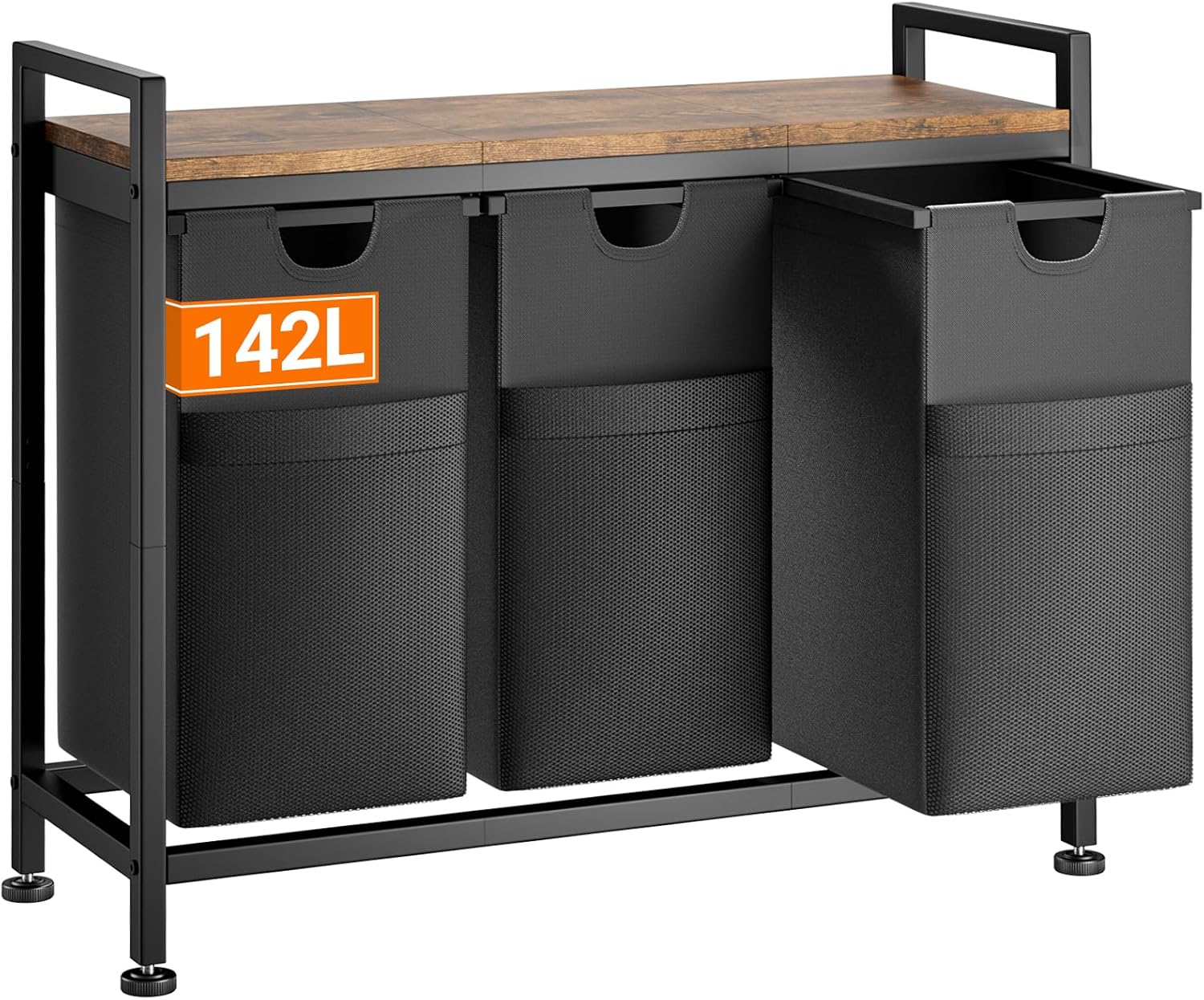 Lulive Laundry Hamper, Laundry Basket Organizer with 3 Pull-Out Removable Bags & Large Top Shelf, 3 × 12.5 Gal (142L) Freestanding Laundry Sorter 3 Sections for Laundry Room, Bathroom and Dorm