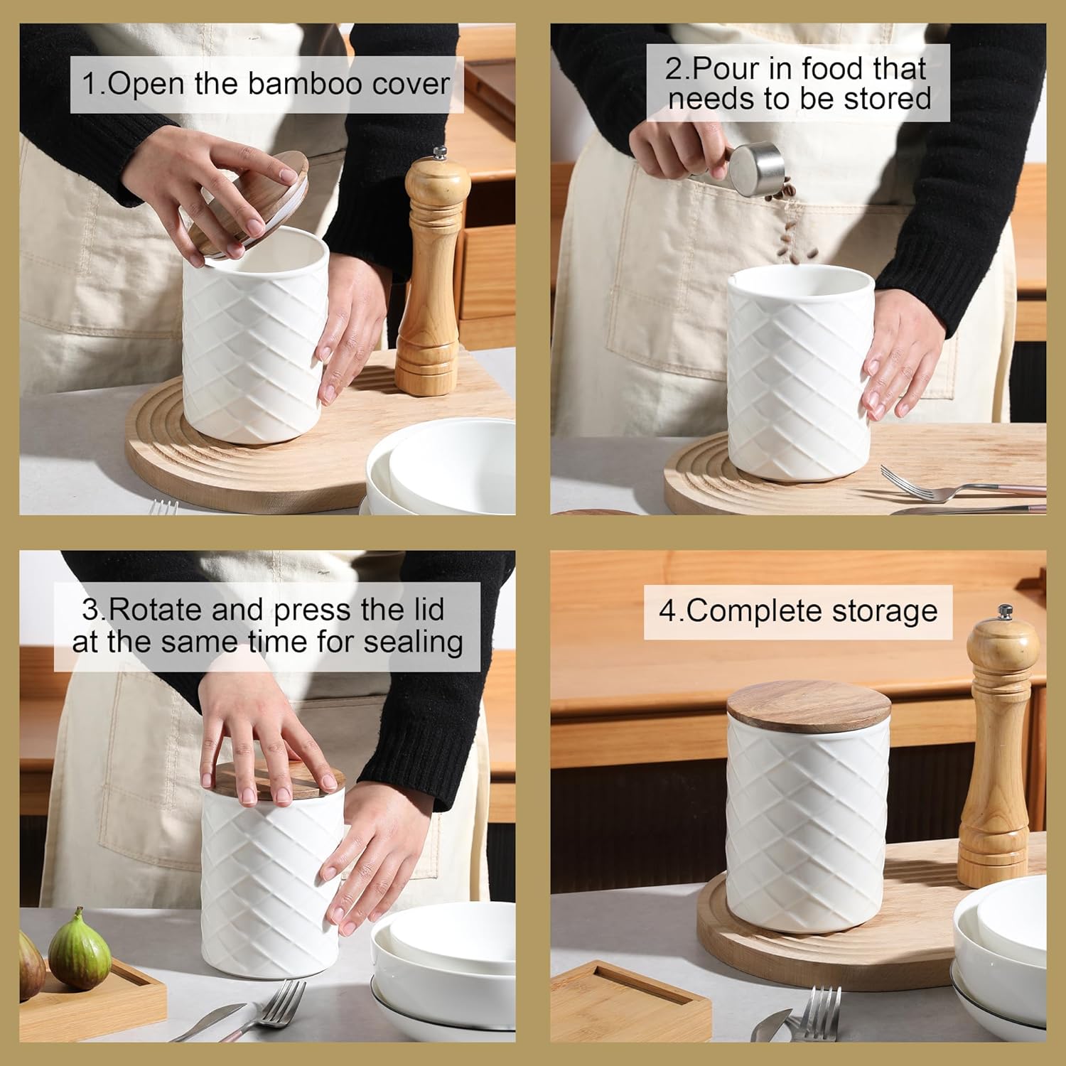 • EASY TO CLEAN - The ceramic storage container is round and smooth, easy to clean. Canisters are dishwasher safe. BUT Lids are hand wash only.