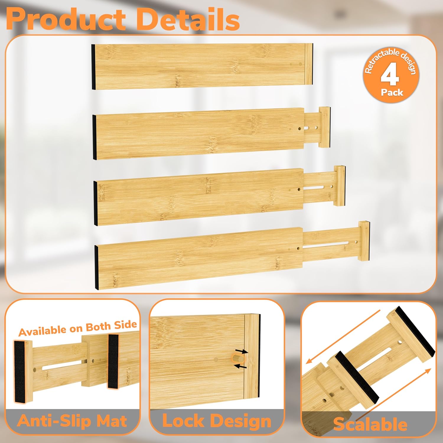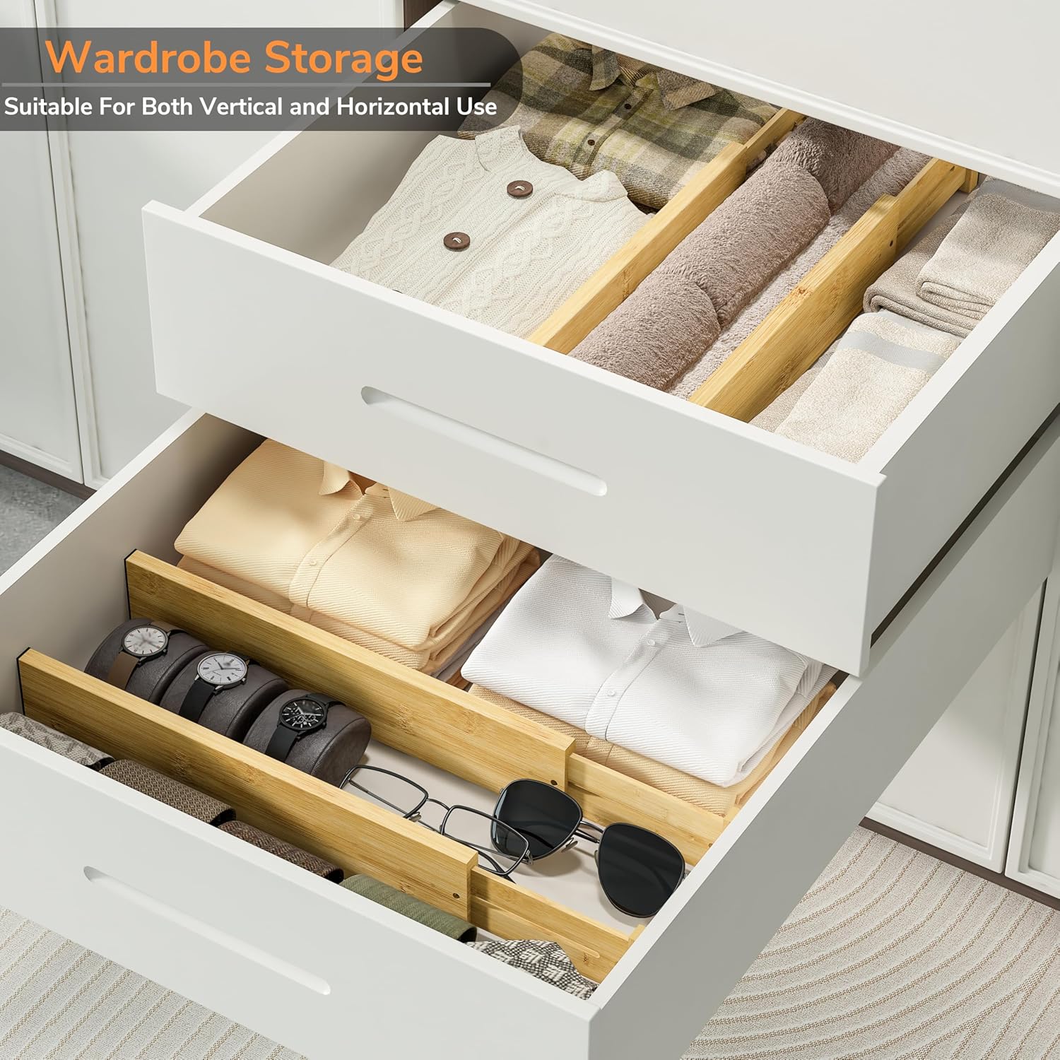 • Premium Bamboo Material: These bamboo drawer dividers are made of high quality bamboo material, natural color, tough texture, smooth surface, well made and long-lasting; Simply wipe it with a damp cloth