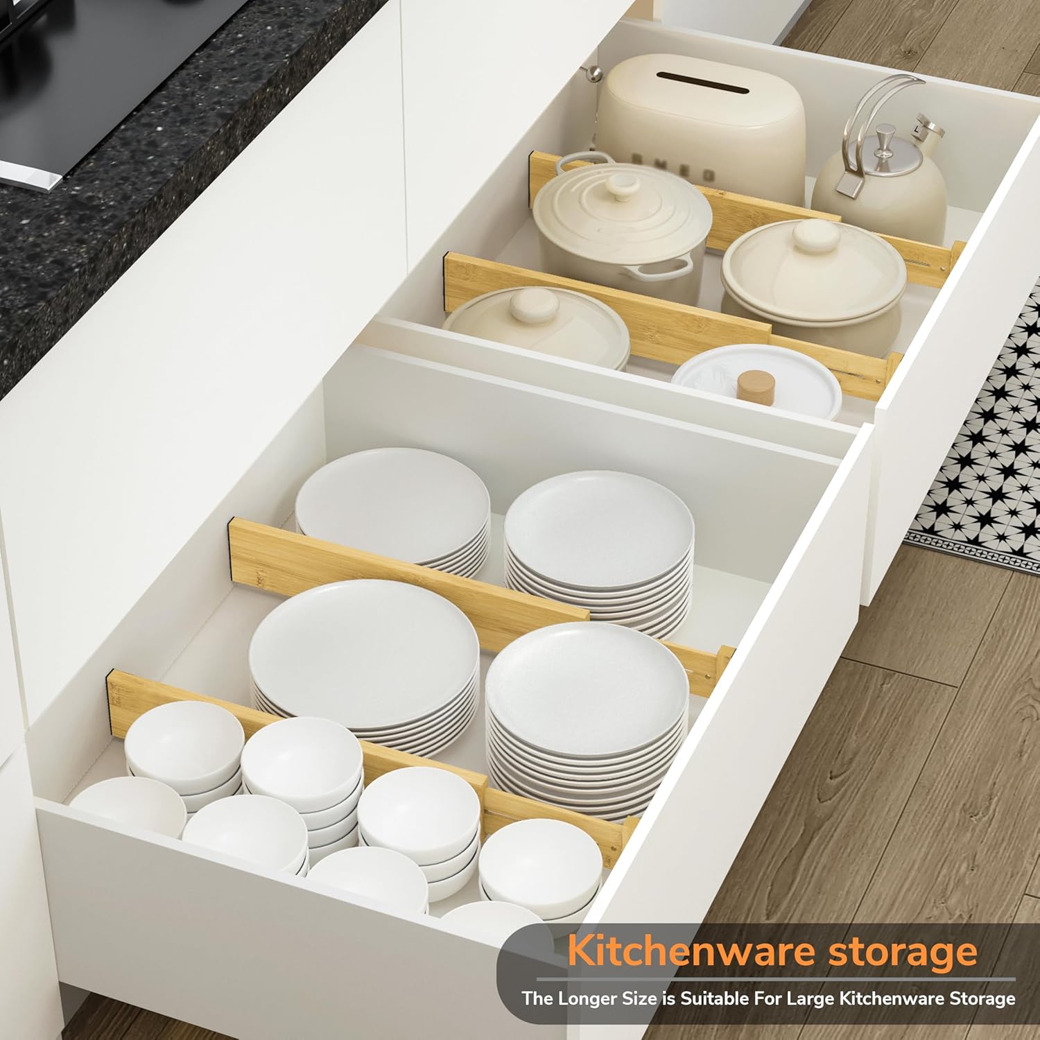 • Expandable design: Each deep drawer divider is 3" H, 0.6"W, and 16.65" to 22.2"L, which can be adjusted according to the size of the drawer, adapting to different furniture needs