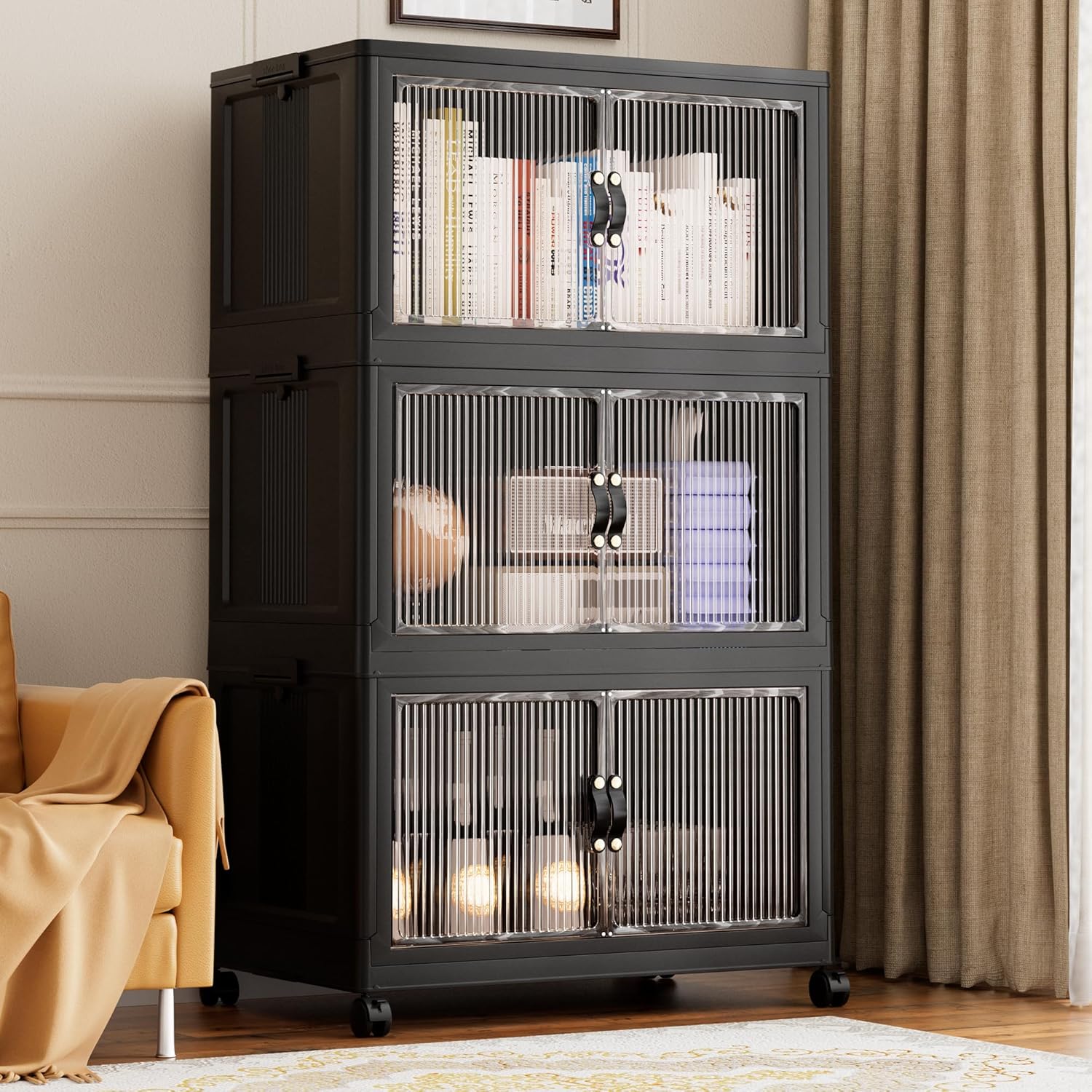 Jalove 88QT Plastic Storage Bins with lids, Stackable Collapsible Storage Containers with Wheels, Closet Organizer and Storage Drawers, Clothes Storage Cabinet for Home Office Garage, 3 Pack Black