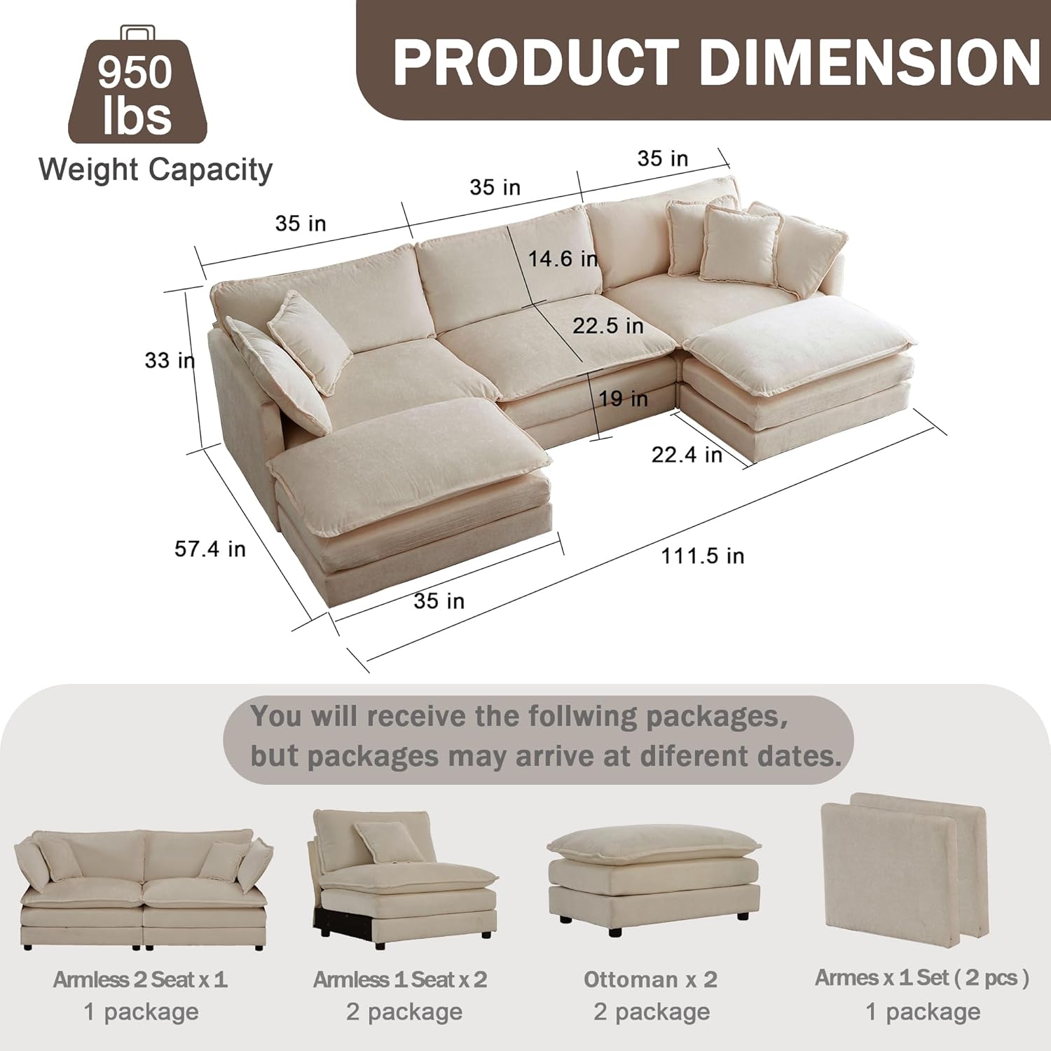 • Premium Comfort & Customizable Sizing: Available in 146.5" U-Shape, 146.5" L-Shape, 111.5" U-Shape, 111.5" L-Shape, and 76.7" L-Shape, this modular sectional sofa adapts to any room size. Featuring ultra-plush 5-layer chenille cushions with high-resiliency foam, it offers cloud-like softness whether lounging, sitting, or napping. Perfect for living rooms, apartments, offices, or dorms.