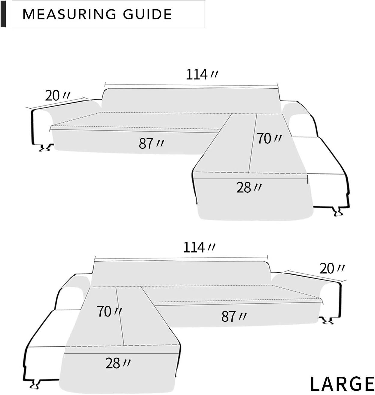 • Dimension: We have three sizes to choose. Please measure before purchasing. See measuring guide in photos. One sofa cover also suitable for L-Shape Sofa Left and L-Shape Sofa Right.