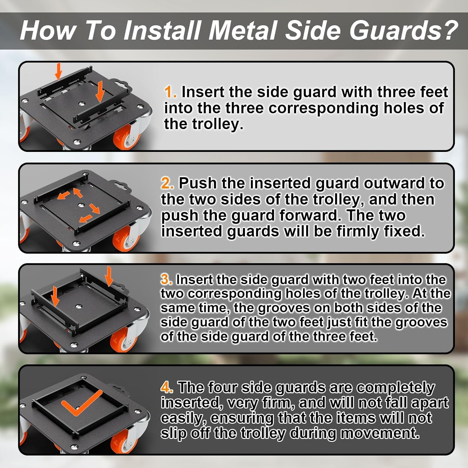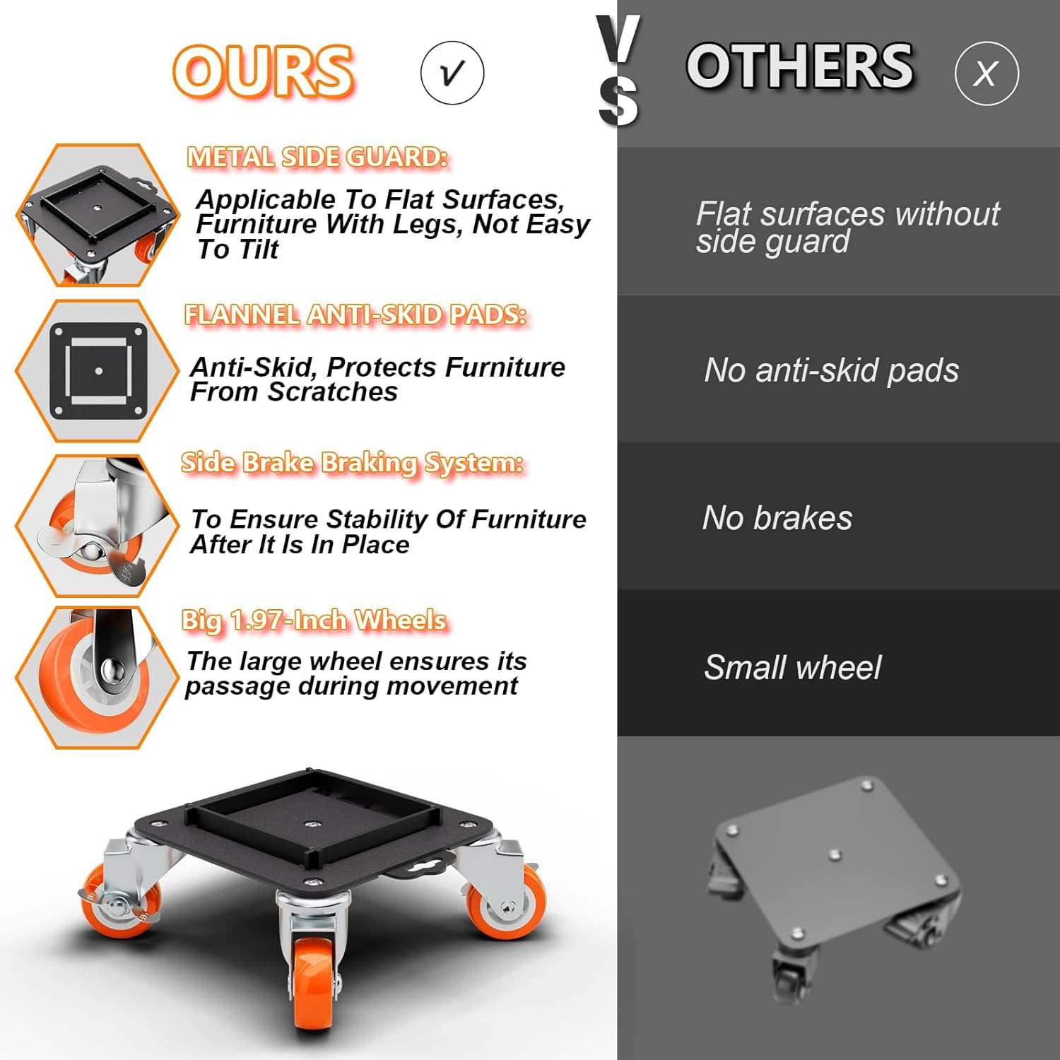 • [Removable Side Guard Design]:This upgraded heavy duty furniture dolly features secure metal side guards that stabilize items with legs,preventing tipping during transport.Ideal for safely moving tables,chairs,and more,this design ensures controlled and safe furniture transportation.