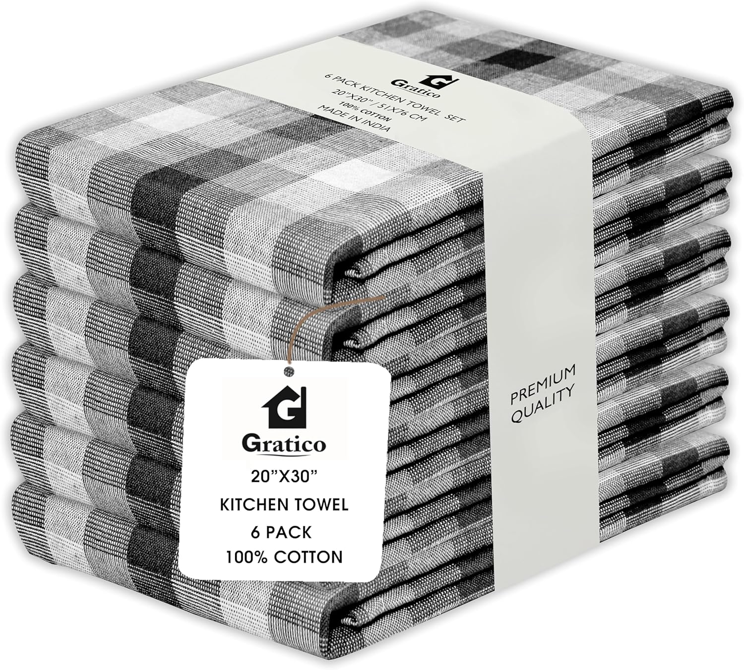 Kitchen Towels Set of 6 Black/White Checks 20x30 Inches 100% Cotton Highly Absorbent Kitchen Towels Premium Quality Ultra Soft Mitered Corners