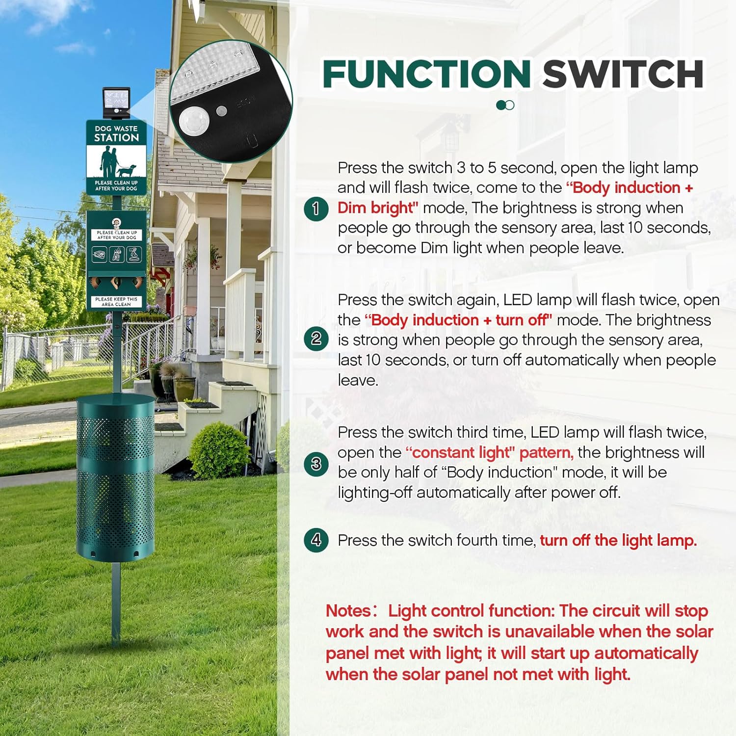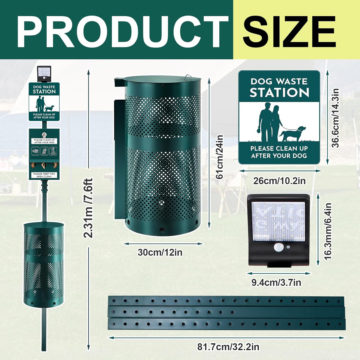 • Sturdy and Durable: Our dog waste bin outdoor is built to last; It's made of powder coated galvanized steel, a material known for its durability and rust resistance; This means even if it is left outside for a whole year, it will not be damaged or rust just like other solar dog poop stations; Plus, pet waste bin color won't fade over time, ensuring its quality appearance lasts