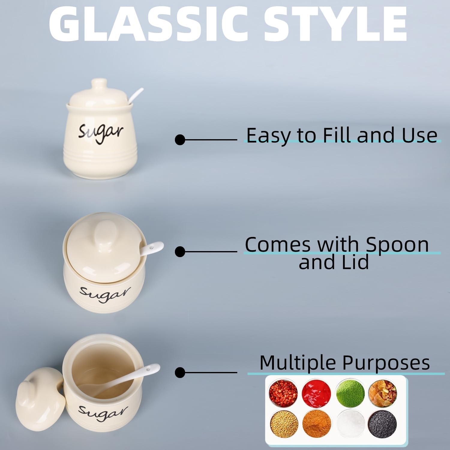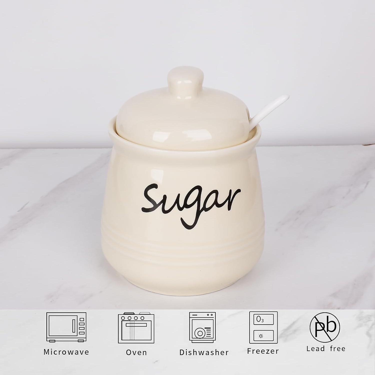 HAOTOP 12oz Sugar Bowl with Lid and Spoon,Ceramic Sugar Jar Sugar Dispenser Sugar Container Coffee Bar Accessories, Kitchen Countertop Canisters, Beige
