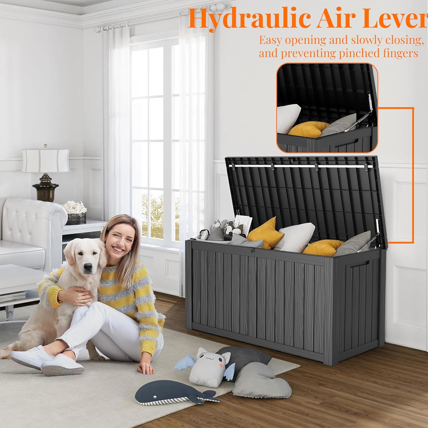• ADAPTABLE TO VARIOUS SCENES: Whether used as an indoor laundry storage chest or an outdoor deck box container for items like outdoor cushions, garden tools, pool accessories, and sports equipment, this patio storage box provides abundant space. It's also versatile as a side table, yard seat, storage bench, or footrest
