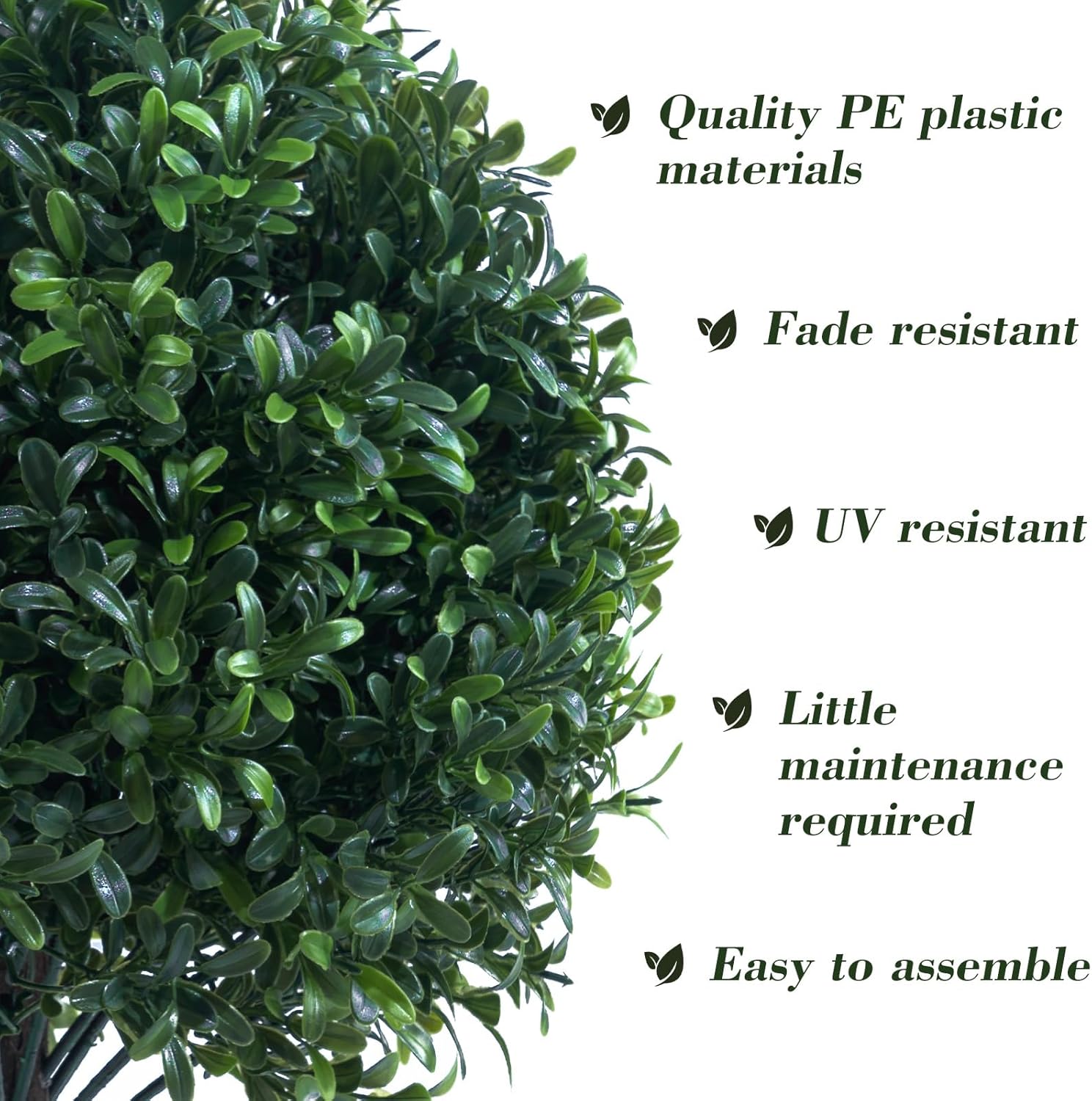 • 【EXCELLENT QUALITY】 The 2 pack of artificial boxwood topiary ball bushes with spikes for outdoor & indoor are made from premium material, designed to be UV resistant, waterproof, and fade proof. Size:22"H x 15"D x 15"W (Including the 4.7 inch height spikes). We have enhanced the density of the leaves making them look more lifelike and lush. The surface of the branches also has features realistic textures