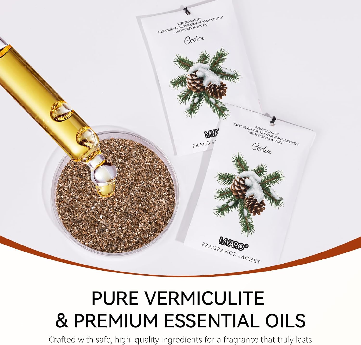• Refreshing Cedarwood Scent -12 Pack Scented Sachets: Each box includes 12 MYARO cedarwood-scented sachets (4.13" x 2.76"), infused with plant-based essential oils. A clean, woodsy aroma helps refresh your home naturally—ideal for those who love nature-inspired home fragrance