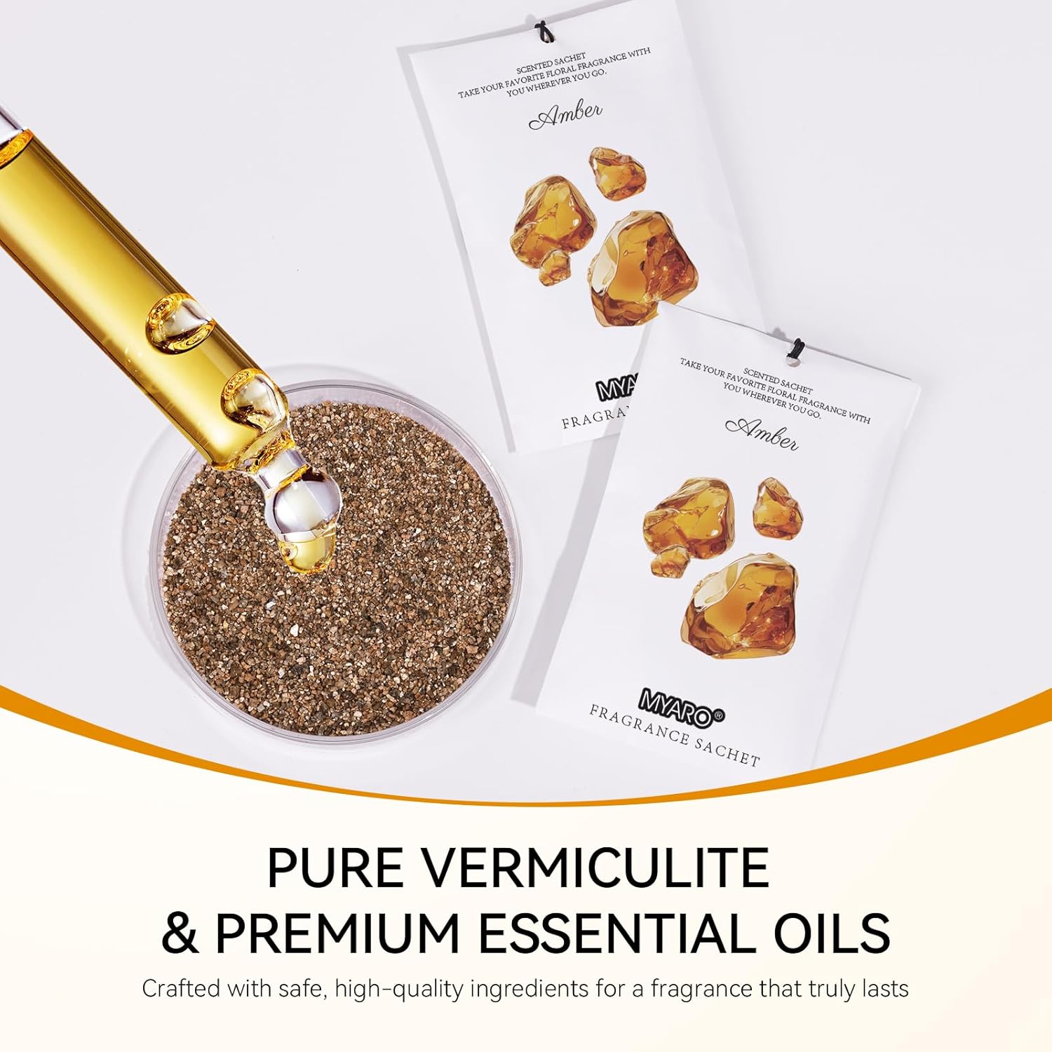 • MYARO Amber Sachet Bags: Includes 12 scented sachets (each bag size: 4.13 inch x 2.76 inch). Our natural fragrance will take you on a journey with the amber fresh scents sachet packets