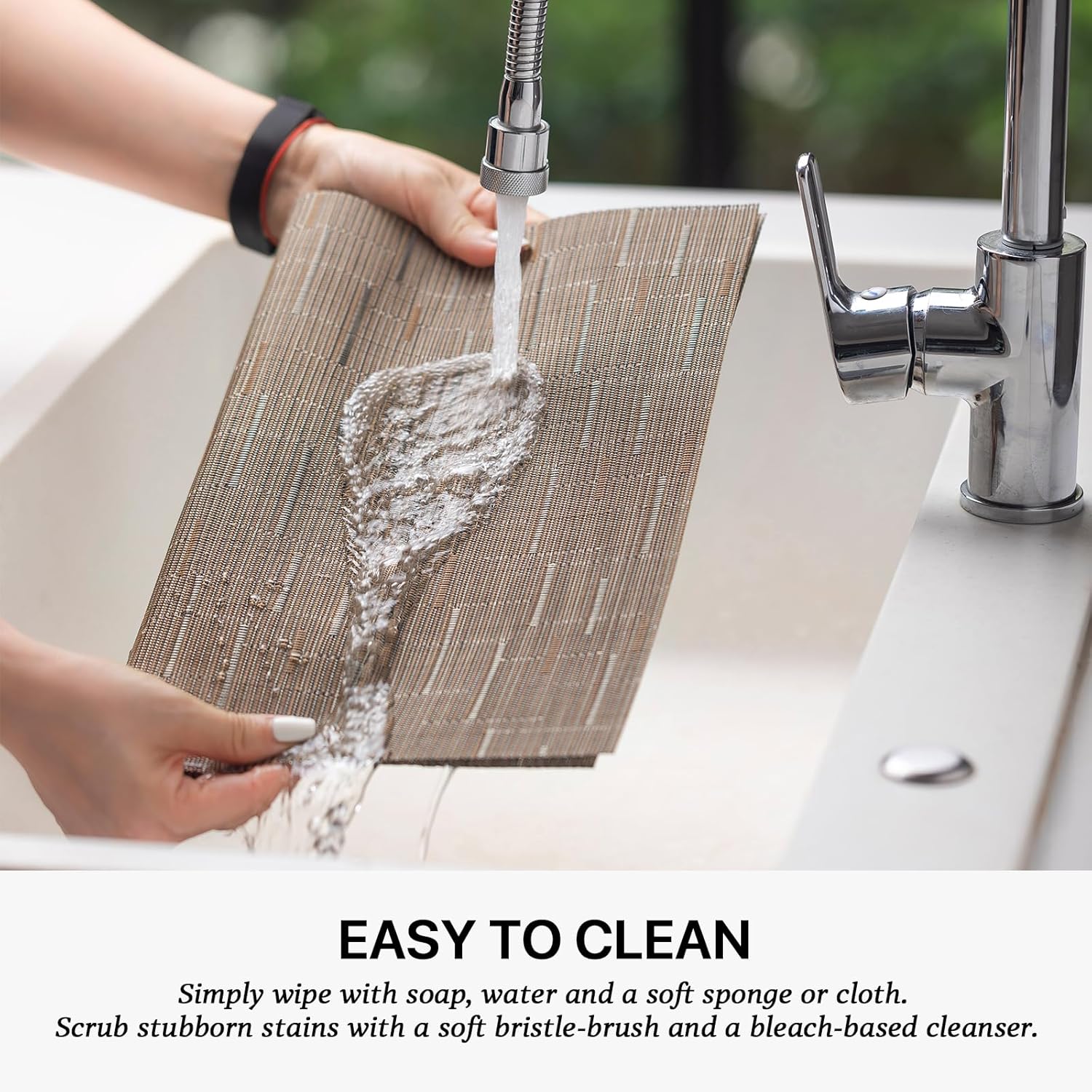 • EASY TO CLEAN:The washable placemats can be washed repeatedly.How to clean the place mats for kitchen table:Simply wipe with soap,water and a soft sponge or cloth.Scrub stubborn stains with a soft bristle-brush and a bleach-based cleanse.