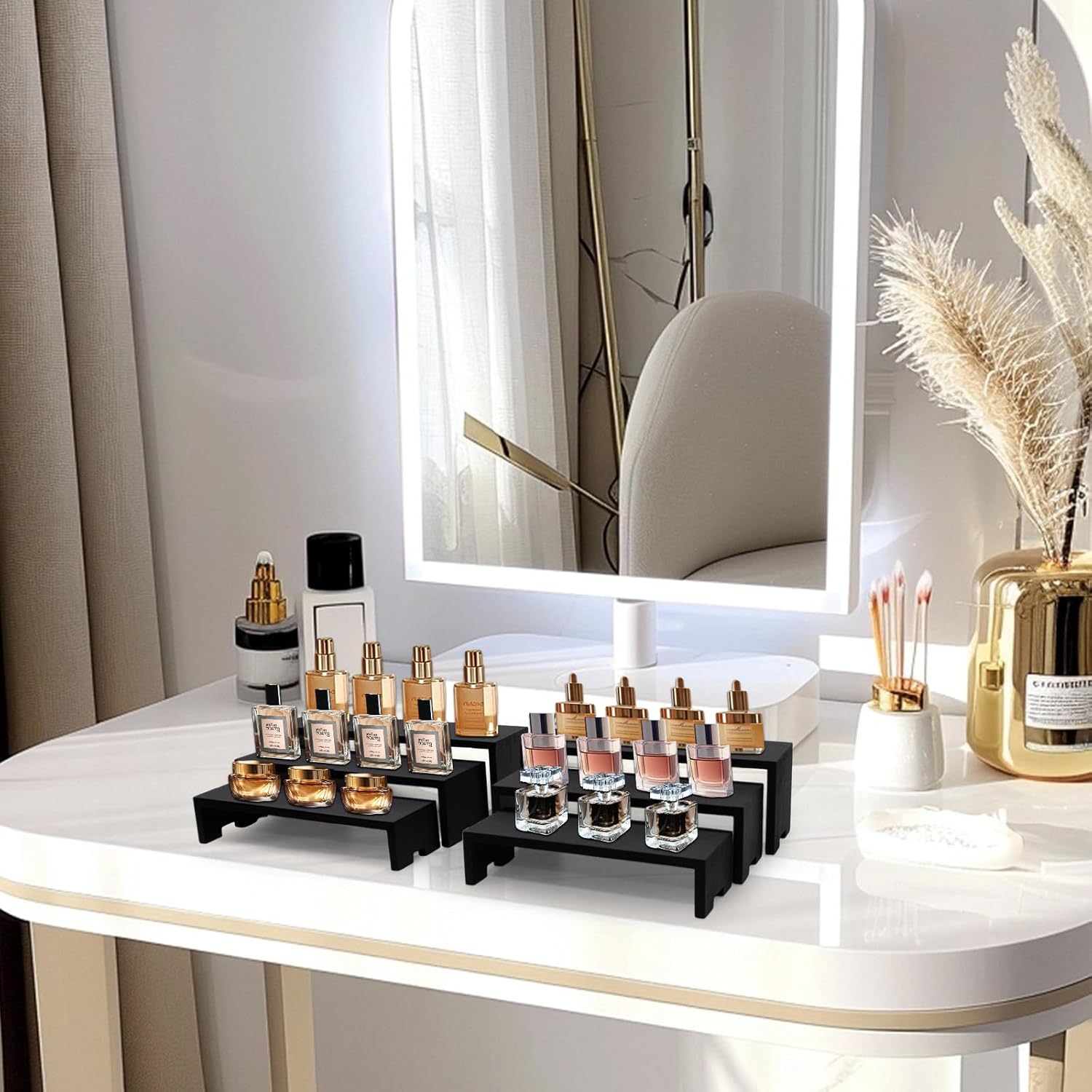 • 【Wooden Tierd Risers for Display】🎁: This 2 set 3 tier small display shelf for cupcakes or vendors has stackable nesting design, so the wooden display risers easily access as desktop storage racks,also they has strong load-bearing capacity for more kinds perfumes, collectible figures,kitchen condiment bottles, bathroom toiletries because of varieties size of (L7.8''/20cm-8.6''/22cm-9.4''/24cm)XW2.9'' /7.3cm