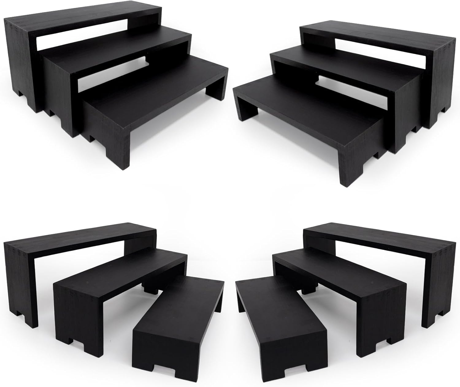 • 【Wooden Tierd Risers for Display】🎁: This 4 set 3 tier small display shelf for cupcakes or vendors has stackable nesting design, so the wooden display risers easily access as desktop storage racks,also they has strong load-bearing capacity for more kinds perfumes, collectible figures,kitchen condiment bottles, bathroom toiletries because of varieties size of (L7.8''/20cm-8.6''/22cm-9.4''/24cm)XW2.9'' /7.3cm