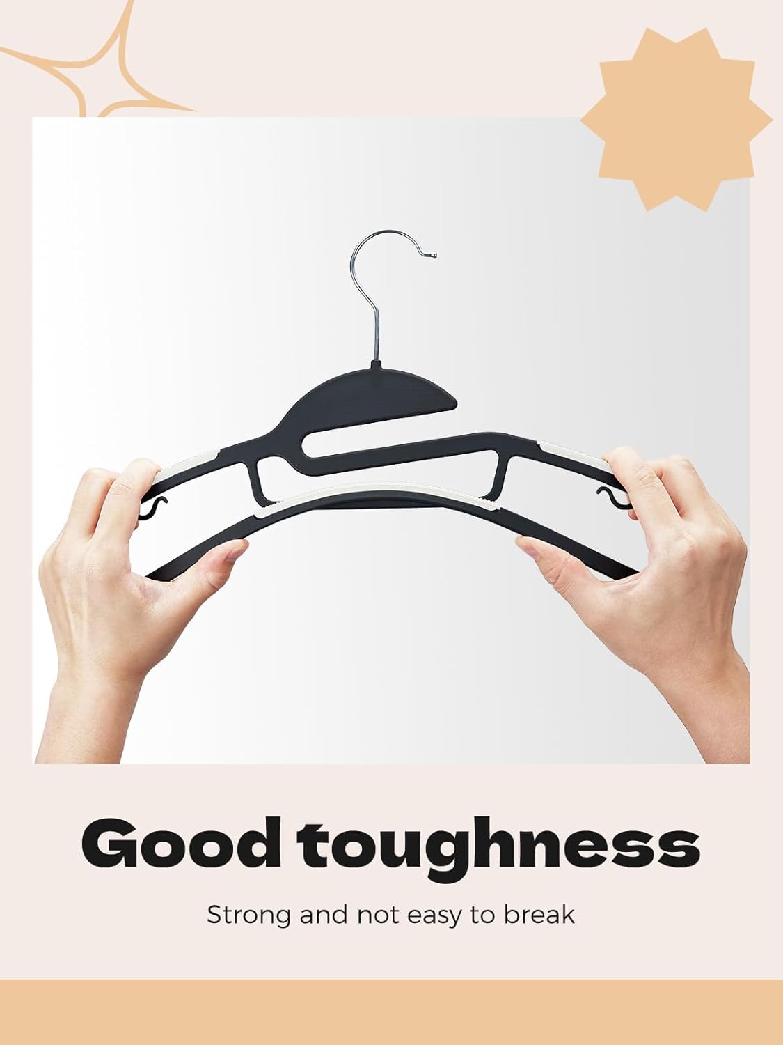 • Non slip Rubber Pads - Rubber pads on the shoulders and bottom bar of the plastic coat hangers can keep clothes securely in place, so you don't have to worry about the clothes slipping off and ending up on the ground. Our non slip hangers is a must-have for your closet!