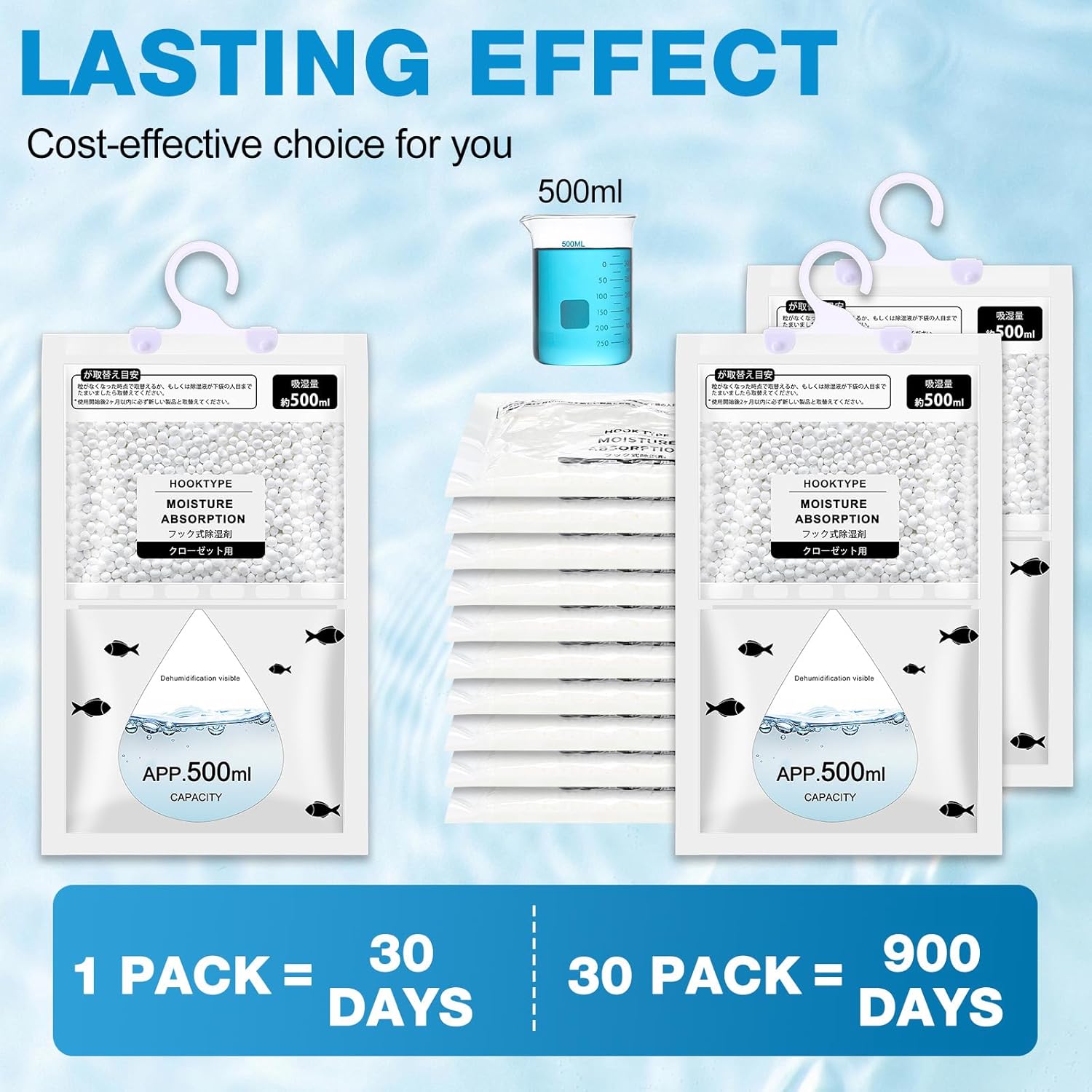 • Easy to Use Storage: no assembly is required; Each hanging moisture absorber bag is stored in a separate bag for easy use and long-term storage; These can be hung anywhere for physical dehumidification; These dehumidifier bags feature an easy-to-hang hook, taking up just a little space in your room and does not affect the appearance