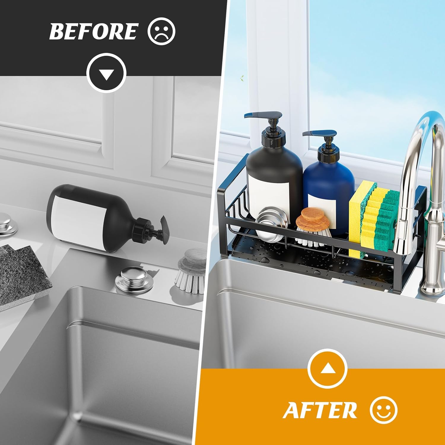 • 【Space Saving Storage】The kitchen sponge holder help you get everything organized and become your handy helper.It can be used for storing hand sanitizer,dish sponges,dish brushes,soap,and sink stopper etc.Saving space and keep your kitchen counter far more cleaner and tidy