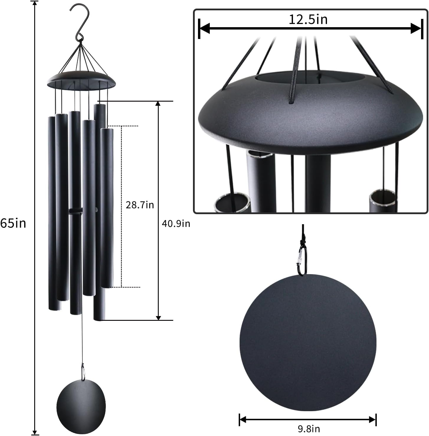 • 65 Inch large Wind Chimes - The longest tube of the large wind chimes is 40.9 Inch,diameter is 2.27 Inch.6 aluminum powder-coated tubes,every metal tube of this large wind chime is hand-tuned by our professional tuning experts to achieve a superior musical performance.Heavy duty nylon cording high density striker for a clear tone and resonances.