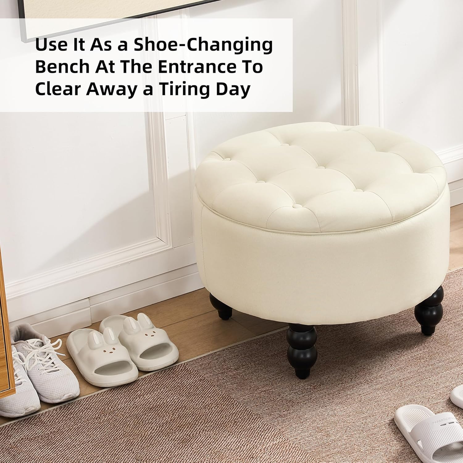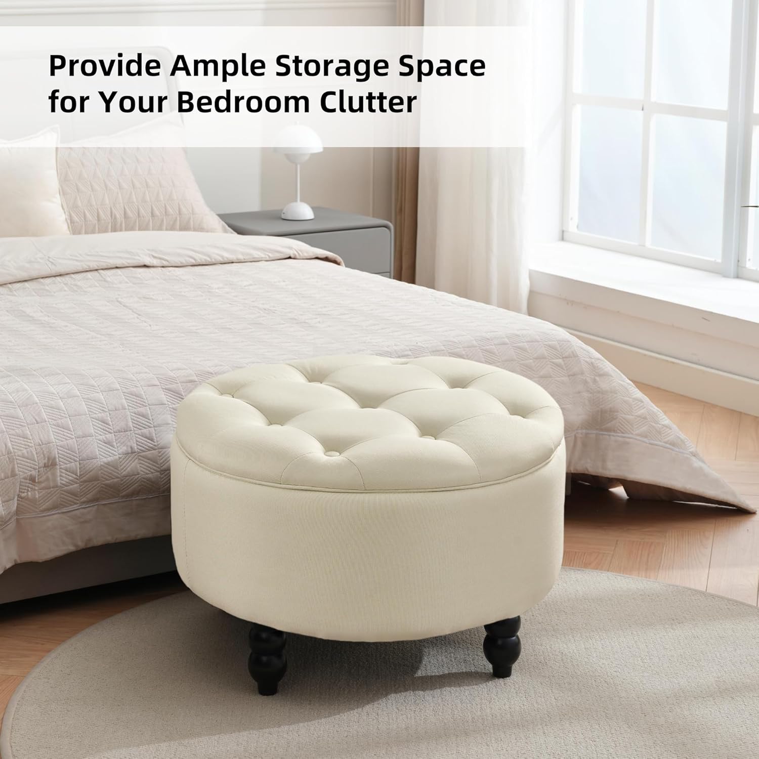 Fabric Round Ottoman with Storage, Upholstered Tufted Storage Footstool, Modern Wooden Coffee Table for Living Room, Bedroom, Beige