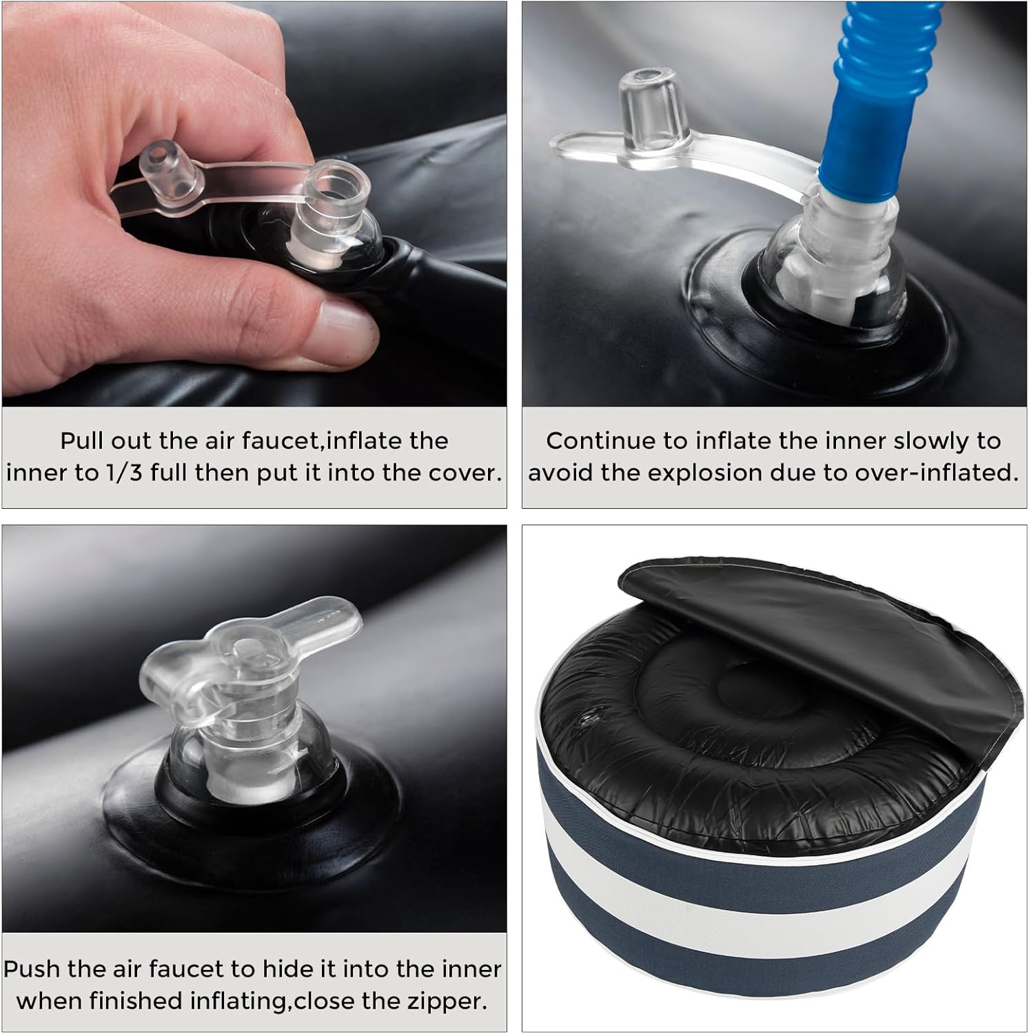 • 【Durable Outdoor Material】-Inflatable ottoman cover made from durable, waterproof material that can withstand exposure to all weather. Fade-Resistant keep its original color and pattern even if exposed to the direct sunlight for over 500 hours. The black inner made of waterproof thick PVC fabric that can bear up 300 lbs.Very easy to clean and maintain.
