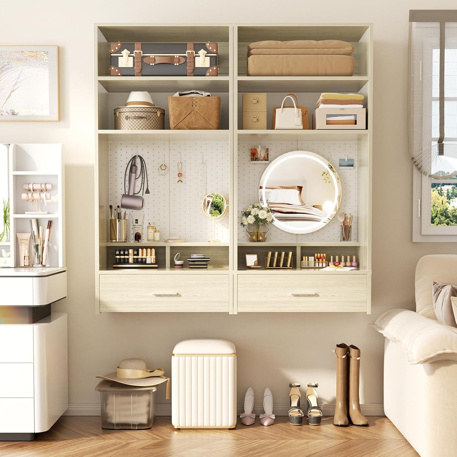 Unikito 24 inch Closet System with Drawers and Magnetic Pegboard, Wall Mounted Closet Organizer with Vanity Storage Shelves, Multipurpose Vanity Desk for Bedroom, Mudroom, and Entryway, White Oak