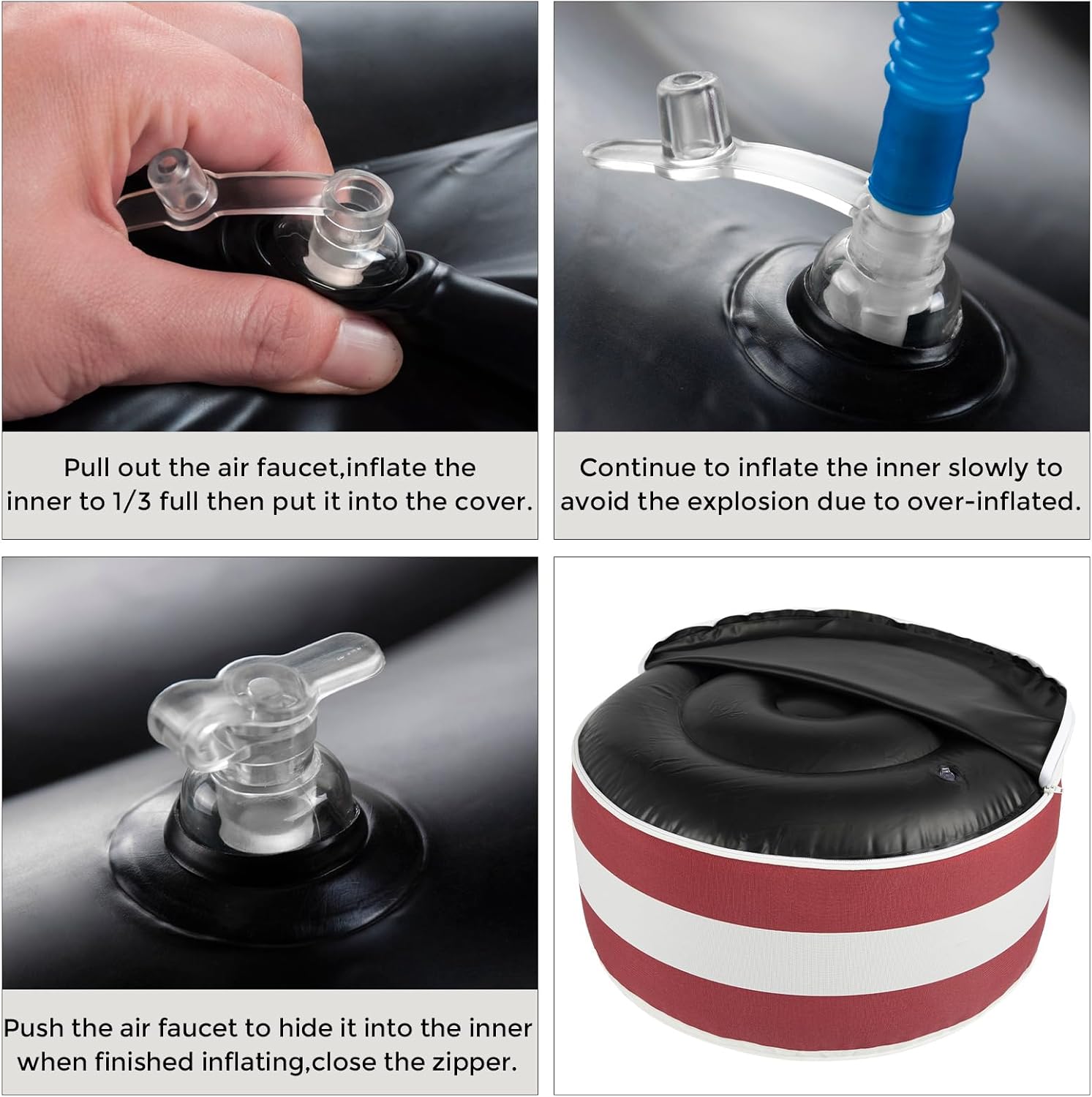 • 【Durable Outdoor Material】-Inflatable ottoman cover made from durable, waterproof material that can withstand exposure to all weather. Fade-Resistant keep its original color and pattern even if exposed to the direct sunlight for over 500 hours. The black inner made of waterproof thick PVC fabric that can bear up 300 lbs.Very easy to clean and maintain.