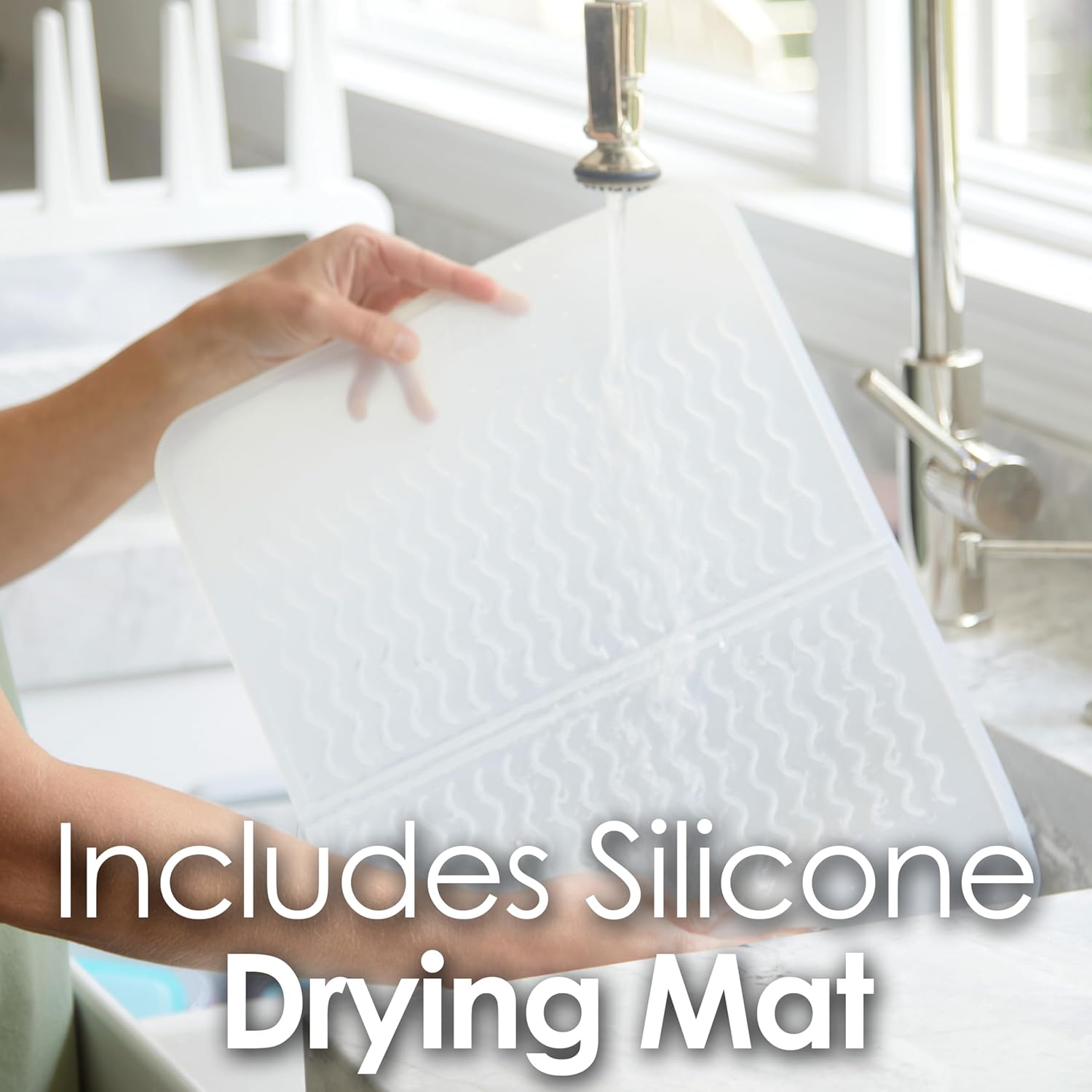 • ✅ BEAUTIFUL SPACE SAVING DESIGN: Great for air drying everyday items like plastic bags, cups, baby bottles, tumblers and most items which are not dishwasher safe. The compact drying rack sits near the back of your counter, leaving the front counter area available for use. The silicone drying mat keeps moisture off of your counter–the clear frosted mat works with ALL countertop colors and folds in half for easy storage.