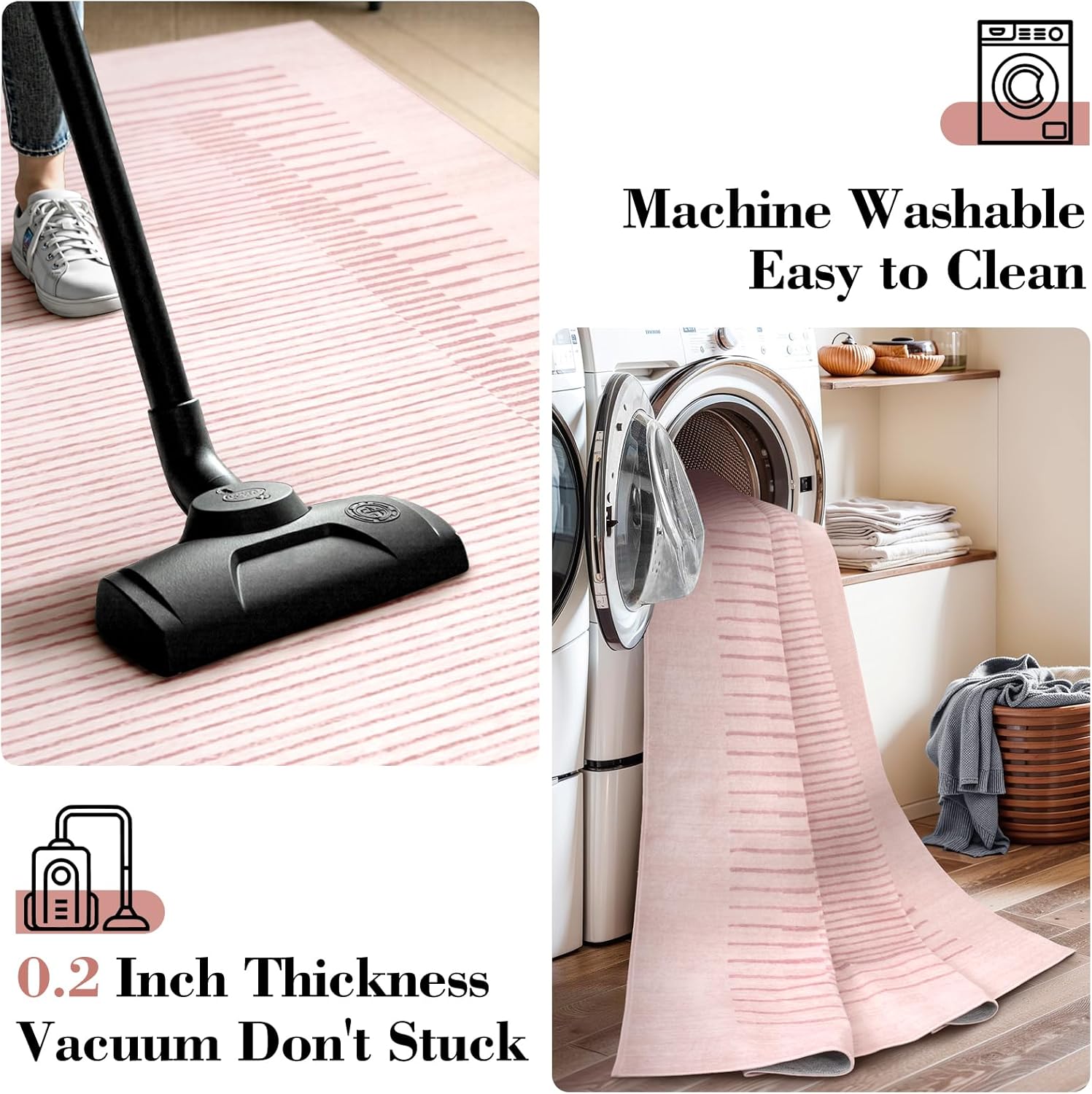 Wonnitar Washable Striped Living Room Area Rug 5x7, Non-Slip Berber Stripe Pink Area Rugs for Bedroom Girls, Low Pile Soft Large Throw Carpet for Kids Nursery Room (Pink,5' x 7')