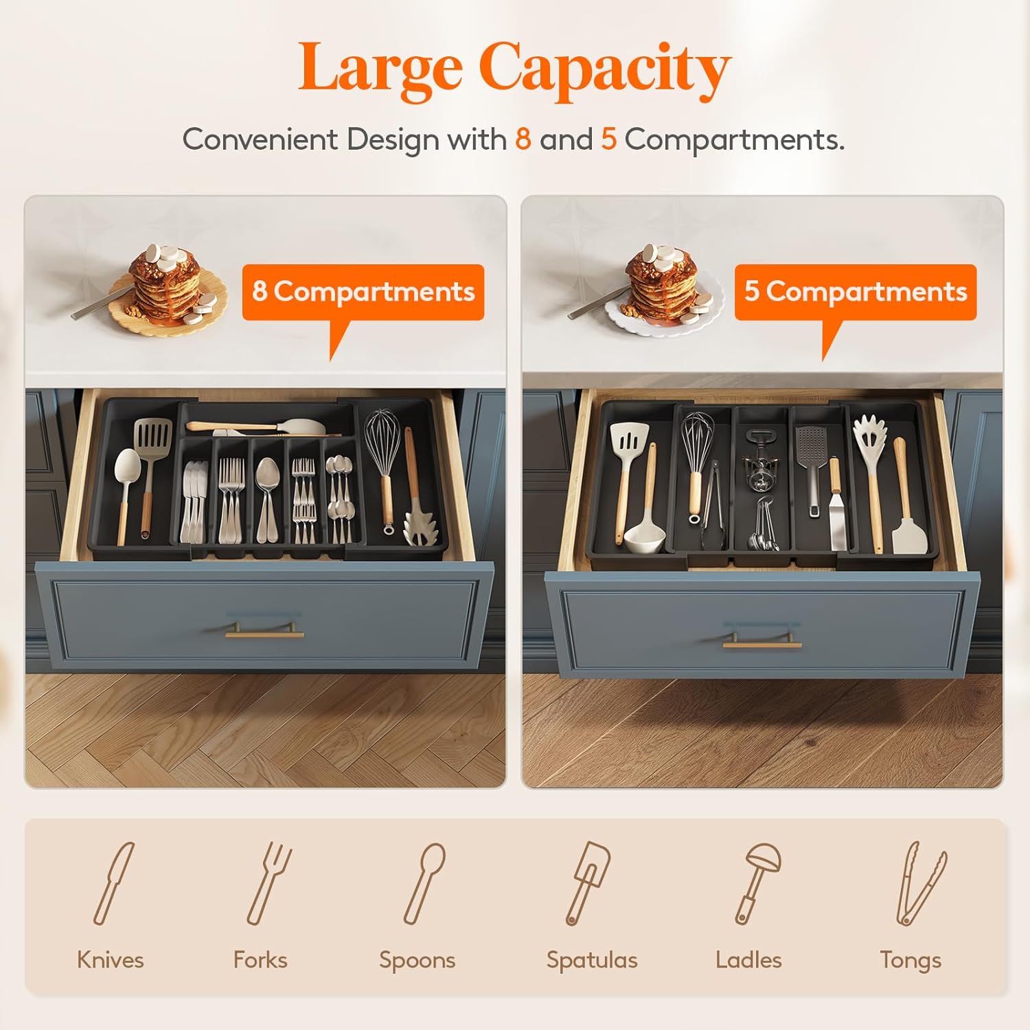• Sort Your Silverware: The flatware organizer has 6-8 compartments for various knife, fork, and spoon sets. And the utensil organizer expands from 3 to 5 slots, offering ample space for larger cooking utensils like spatulas, spoons, tongs, and mixers