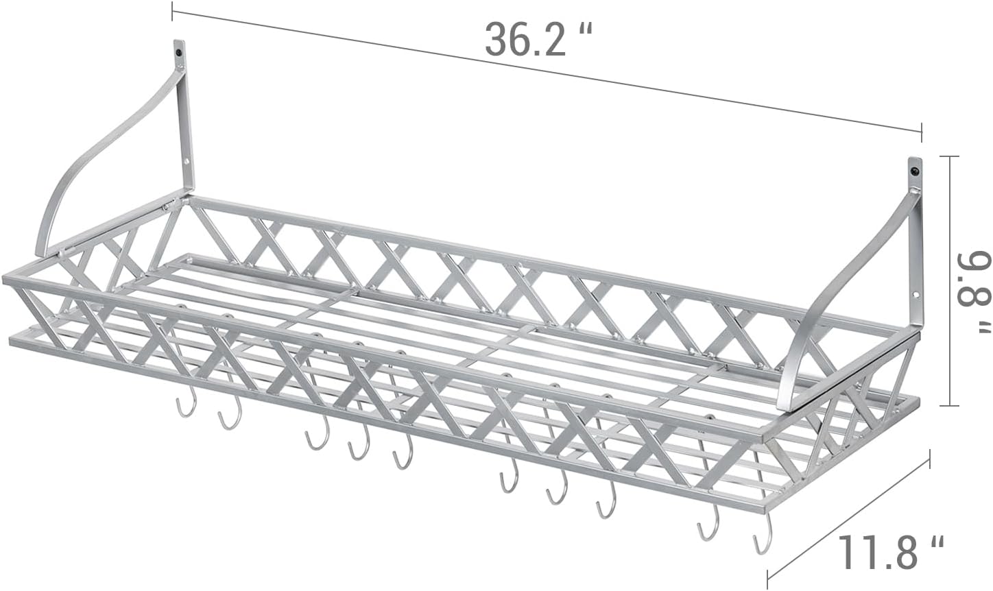 MyGift Wall Mounted Silver-Tone Metal Hanging Kitchen Pots, Pans and Utensils Storage Cookware Rack with 12 Removable S-Hooks and Top Display Shelf for Condiments Spice Rack