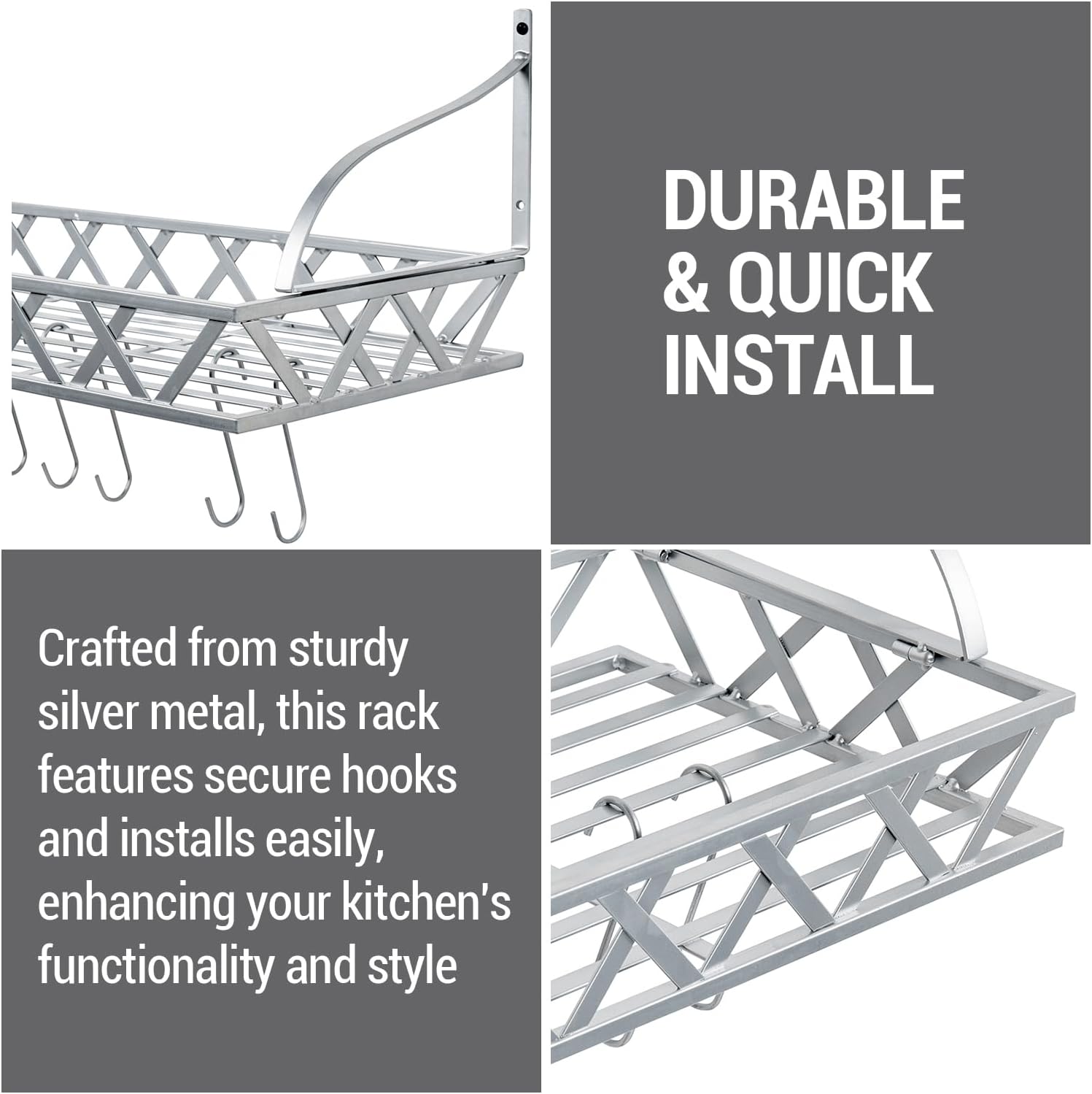 • Made from durable silver-tone metal, this rack offers reliable support for your cookware collection. Its industrial-grade strength ensures it can handle the weight of multiple pots, pans, and kitchen accessories without bending or sagging.