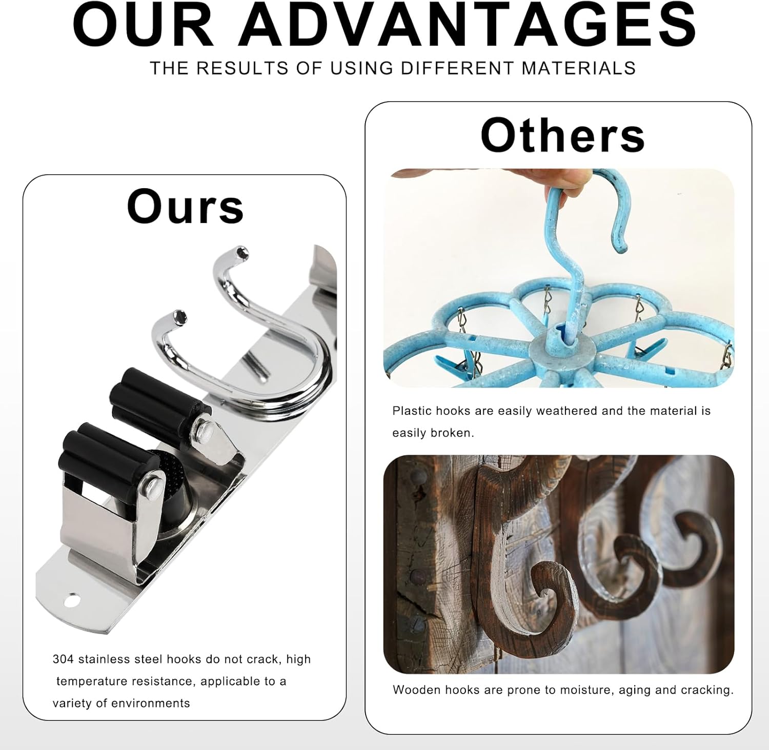 • TOP-NOTCH MATERIALS, SUPERB QUALITY: The Broom Holder wall mount is crafted from top-quality stainless steel that is exceptionally sturdy and long-lasting. There is no need to fret about it breaking or getting damaged. Plus, it won't develop rust even in a damp setting
