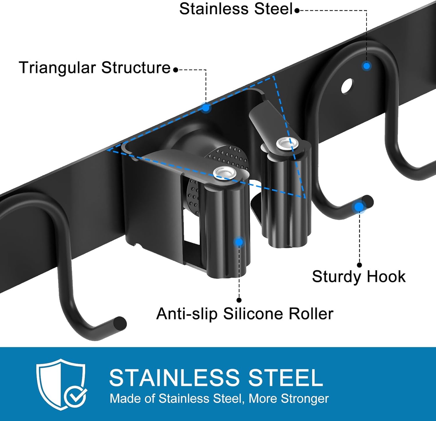 • Premium Stainless Steel Broom Holder: Built with ultra-durable, rust-proof stainless steel for exceptional strength and longevity. Resists damage and thrives in damp environments, no breakage worries