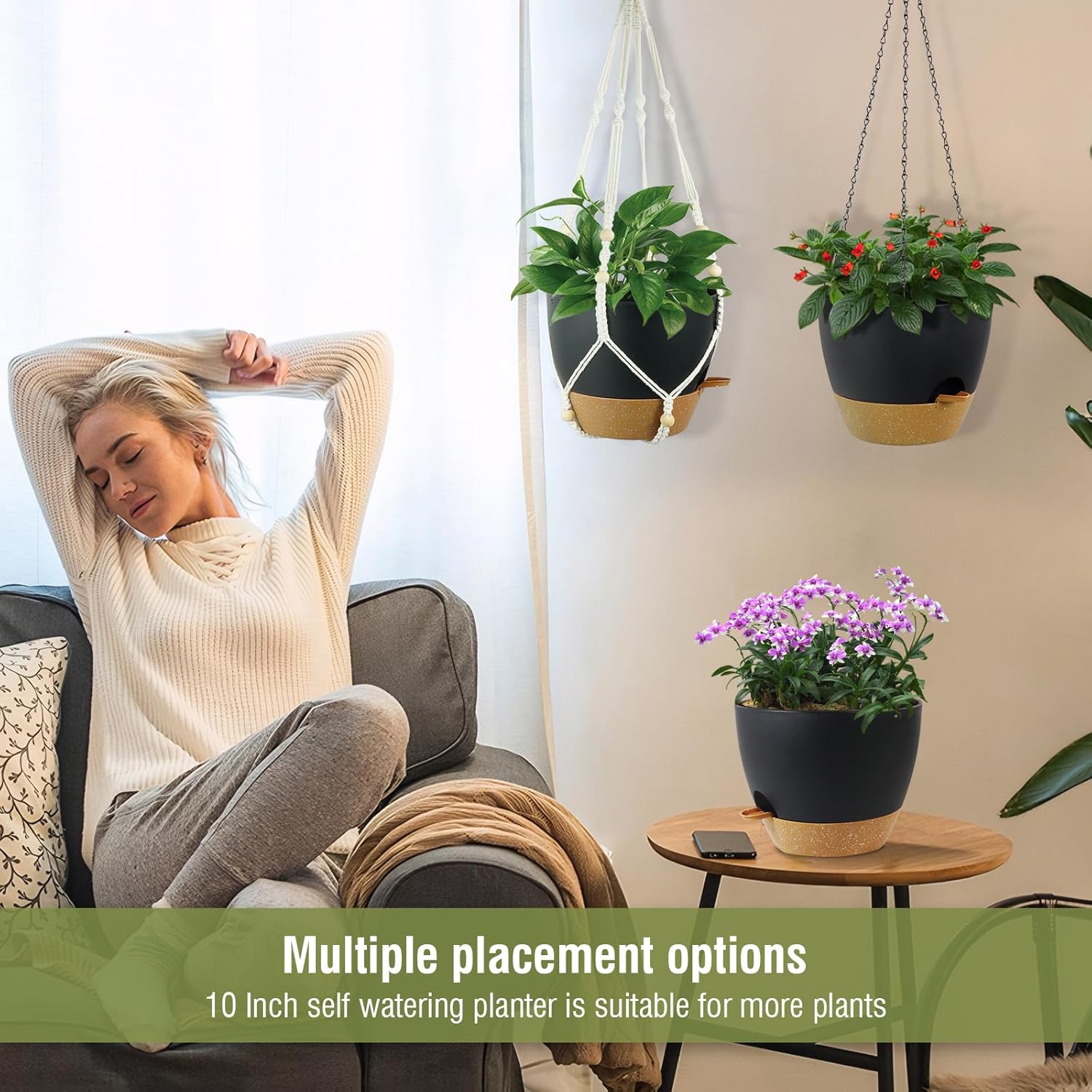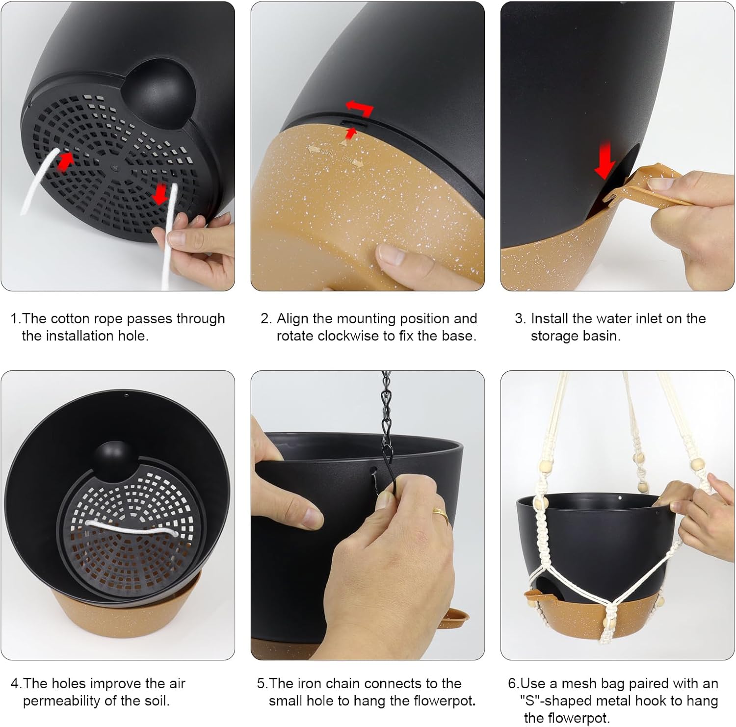 • 【Self-Watering Hanging Planter with Removable Tray】This hanging flower pot comes with a detachable bottom tray that acts as a water reservoir, holding a good amount of water. When your plant needs water, it’s absorbed through cotton wicks from the reservoir to the soil, reducing how often you need to water