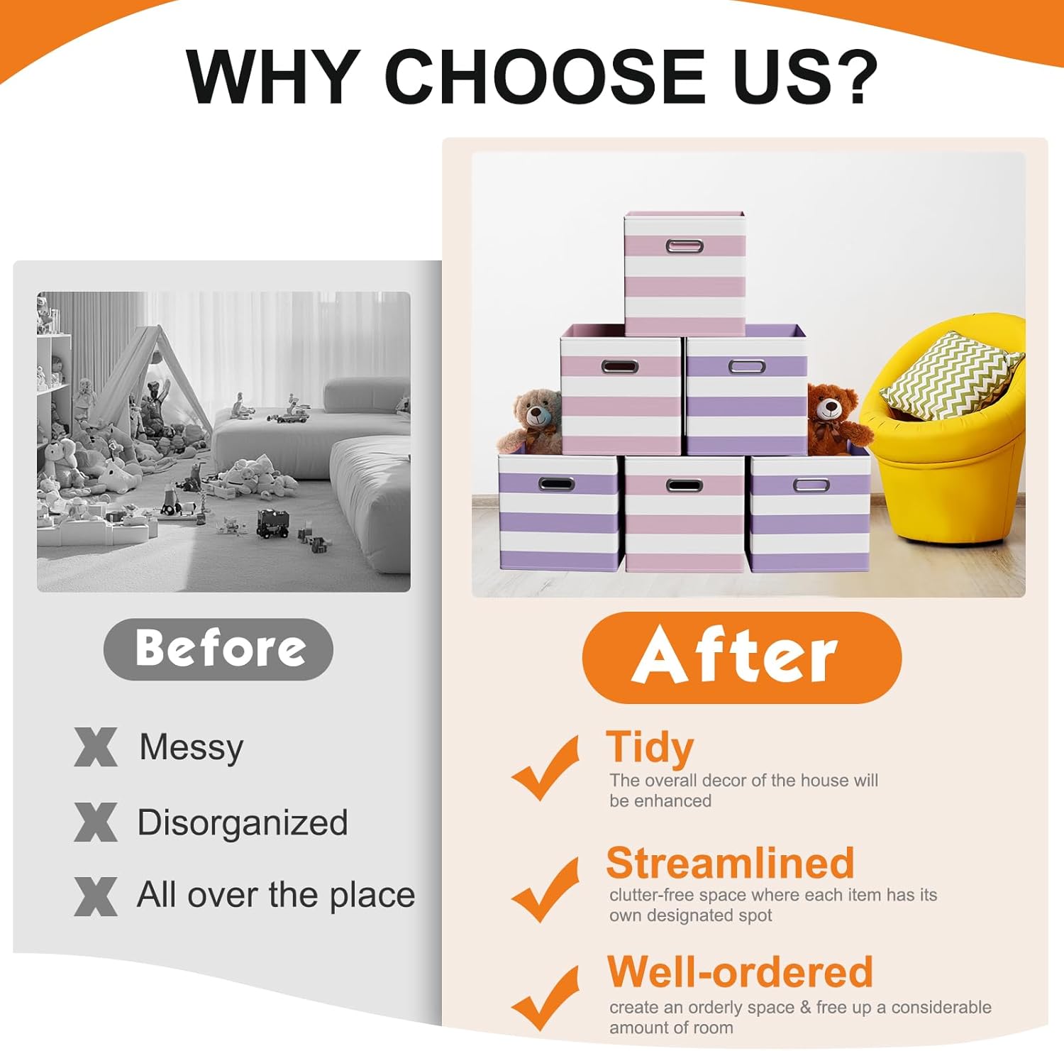 • Wide Range of Uses: whether you're organizing a nursery, playroom, office, or laundry area, these storage cubes are up to the task; They're ideal for stowing away clothes, books, toys, craft supplies, seasonal items, and more; These storage cubes adaptable design fits seamlessly into various spaces, including shelves, closets, bookcases, and desks