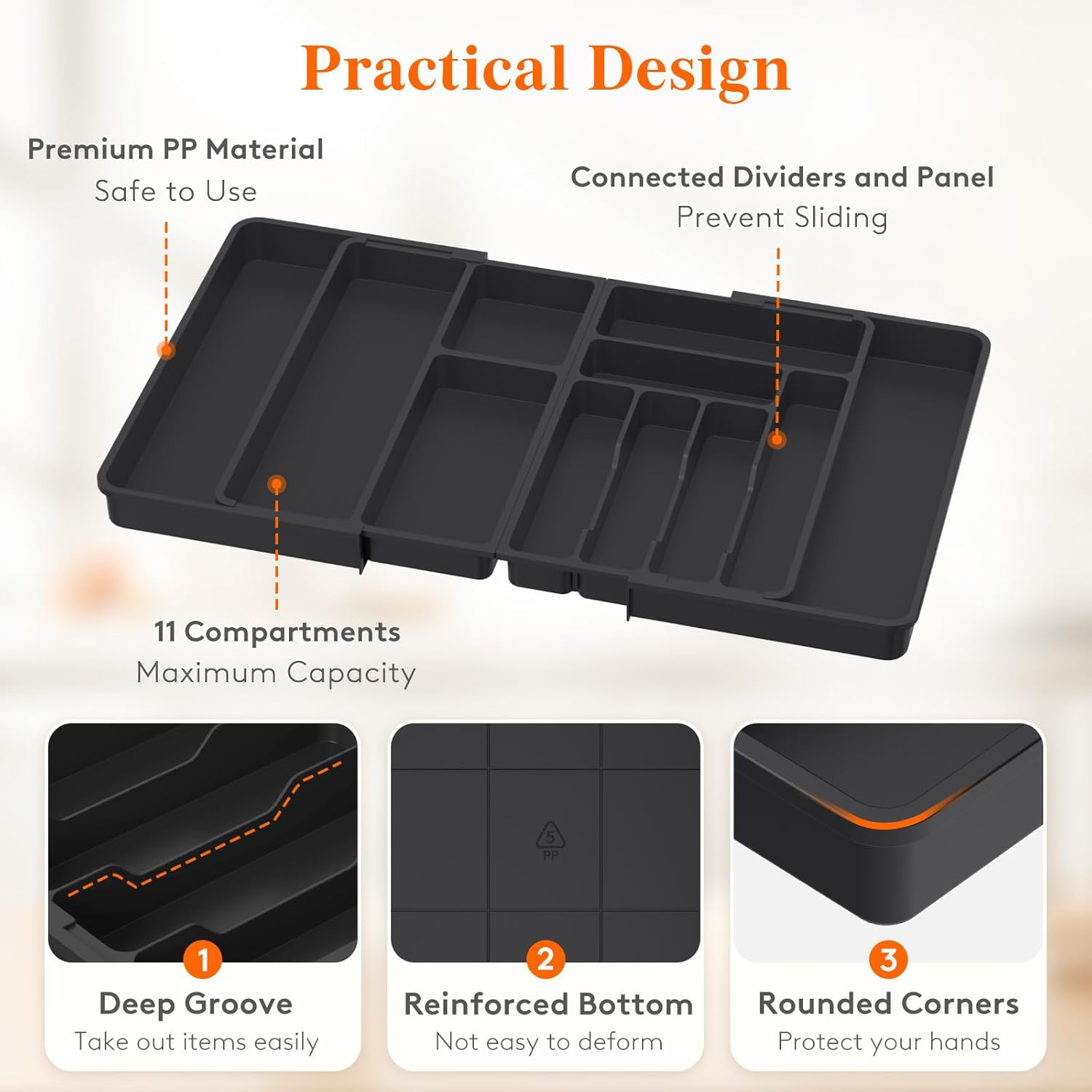 • Robust and Safe: This kitchen drawer organizer is crafted from premium PP material, BPA-free and built to last. It ensures your silverware is stored in a healthy, safe environment for worry-free use