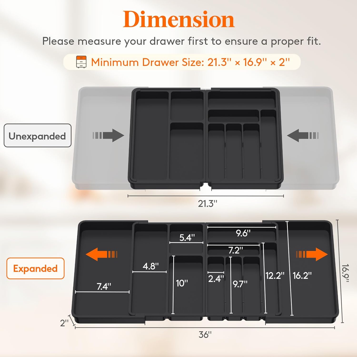 • Adjustable Design: With its retractable design, The Lifewit silverware organizer fits drawers of various sizes and shapes. It measures 21.3' wide when folded while reaching 36'' when fully expanded. This universal utensil drawer organizer helps you maximize storage space efficiently while keeping your utensils neatly organized and easily accessible