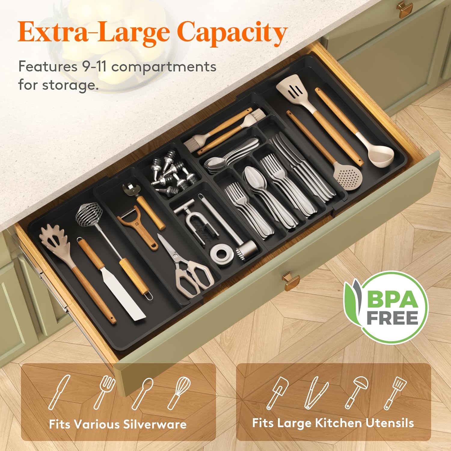 • Sort Your Silverware: The silverware tray comes with 9-11 compartments, creating more space in drawers for spatulas, ladles, tongs, utensil sets, and whisks. Streamline your cooking with a no-install organizer that keeps cutlery at your fingertips